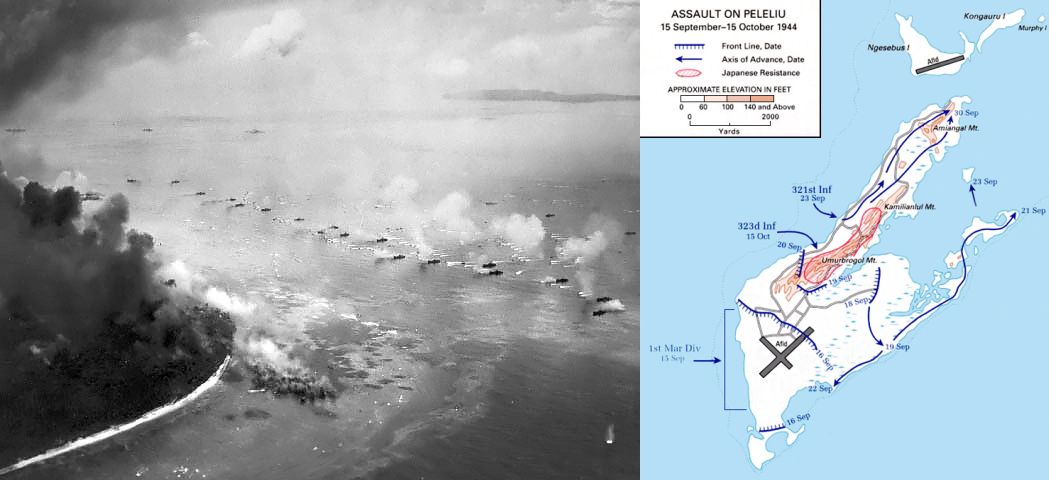 63k | Peleliu - The Battle of Peleliu was fought between the United States and Japan during the Mariana and Palau Islands campaign of World War II, from September 15 to November 27, 1944, on the island of Peleliu. US Marines of the 1st Marine Division and then soldiers of the US Army's 81st Infantry Division fought to capture an airfield on the small coral island of Peleliu. The battle was part of a larger offensive campaign known as Operation Forager, which ran from June to November 1944 in the Pacific Theater. (Wikipedia) Photo - U.S. National Archives photo # 80-G-283553 - The first wave of LVTs moves toward the invasion beaches, passing through the inshore bombardment line of LCI gunboats. Cruisers and battleships are bombarding from the distance. The landing area is almost totally hidden in dust and smoke. Photographed from a USS Honolulu (CL-48) plane. Map - U.S Army Map of the Battle of Peleliu, 15 September - 15 October 1944 |