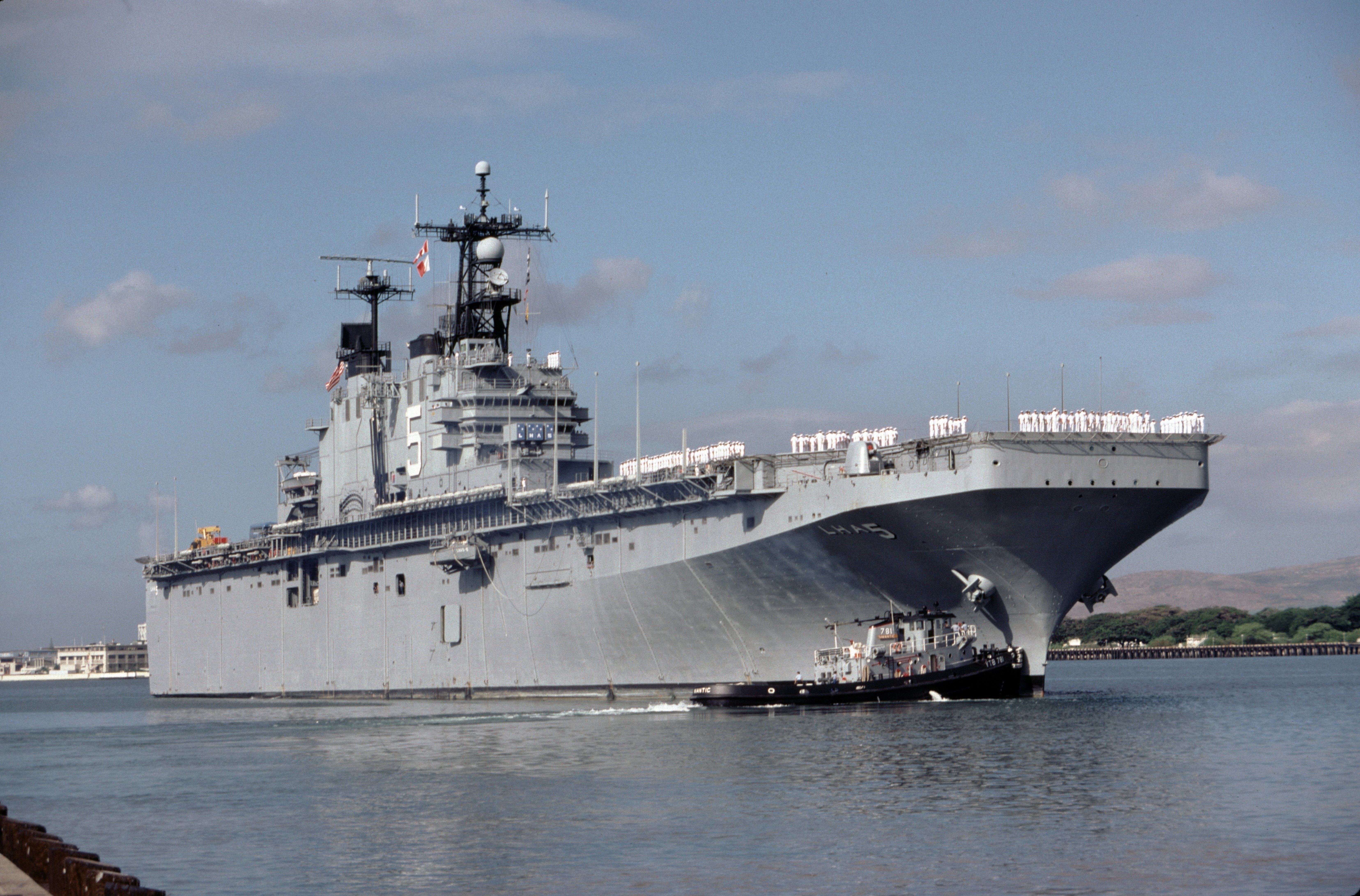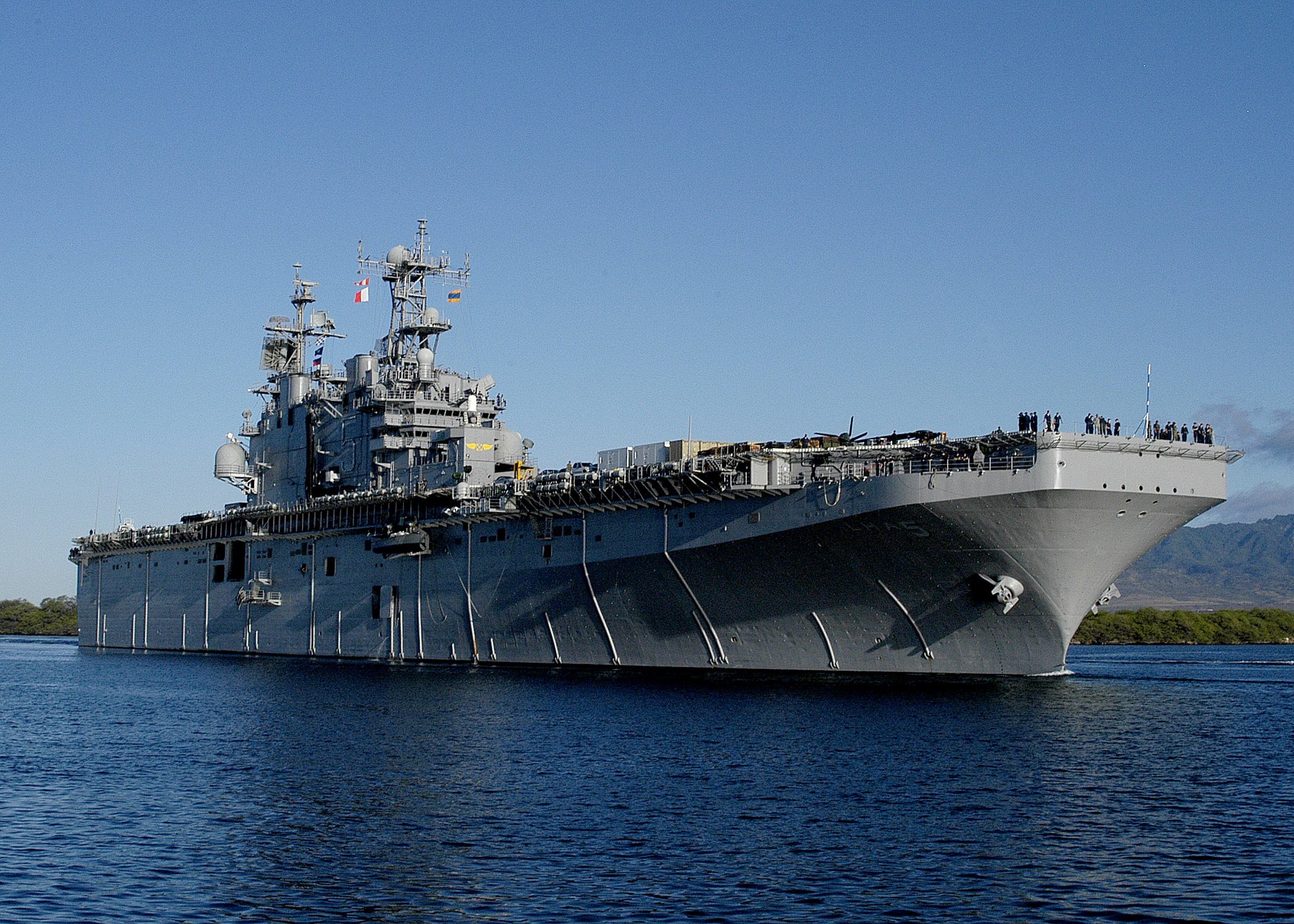 779k | USS Peleliu (LHA-5) arrives for a port call at Pearl Harbor, 29 May 2007. Peleliu is on her way to assist in "Pacific Partnership", a humanitarian and civic mission to several nations in Southeast Asia and Oceania. US Navy photo # 070529-N-1280S-010 Naval Station Pearl Harbor (May 29, 2007) , by MC2 Lindsay Switzer, now in the collections of Defense Imagery.mil. |