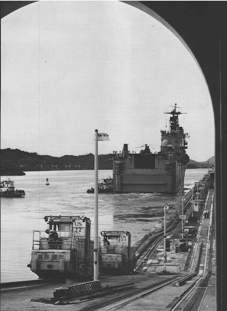 189k | USS Peleliu (LHA-5) passing through Miraflores Lock, Panama Canal, December 1980. Photo by PH3 Joe A. Kalentkowski USN. |