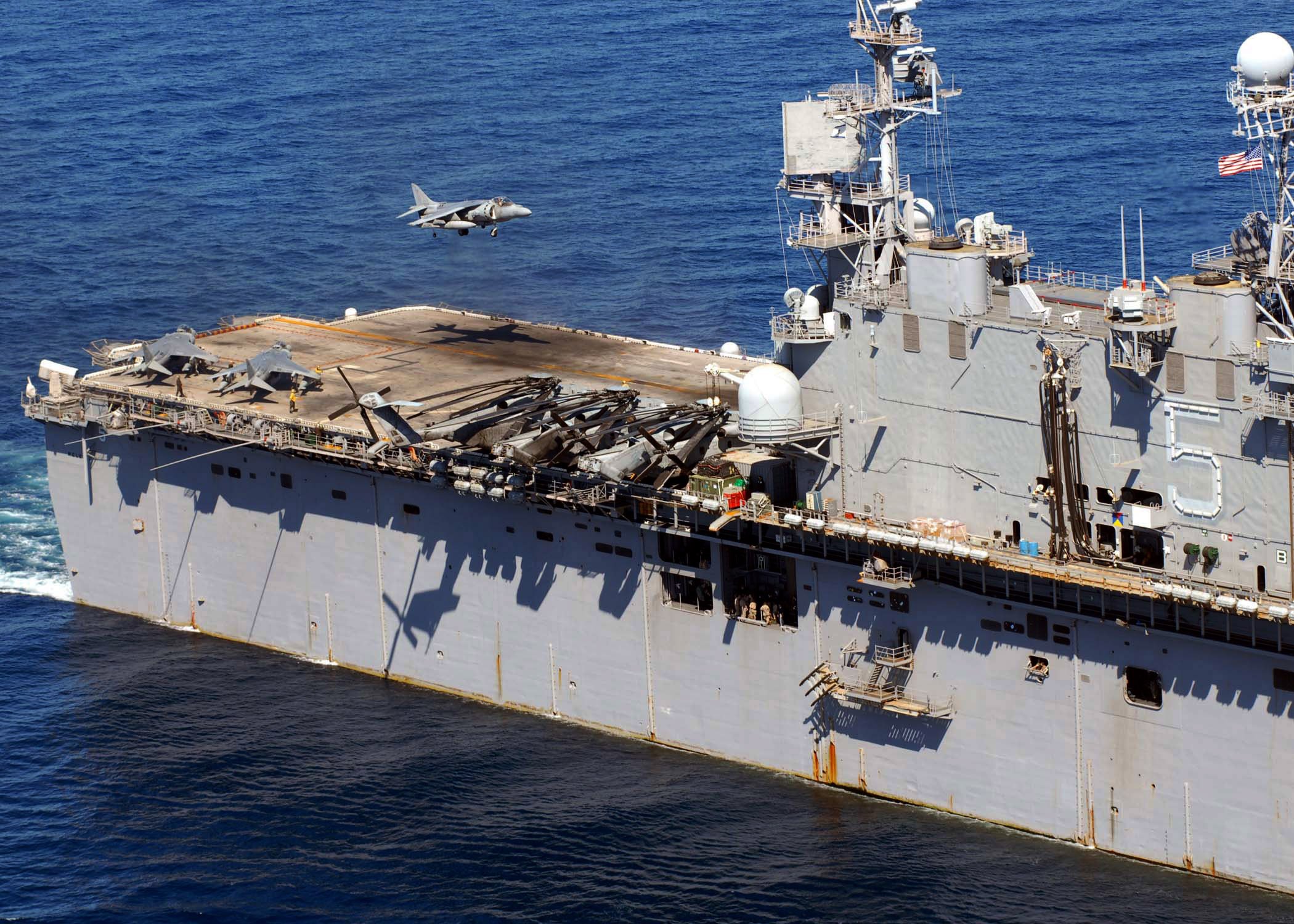 485k | An AV-8B Harrier assigned to Marine Attack Squadron (VMA-311) lands aboard the Tarawa-class amphibious assault ship USS Peleliu (LHA-5) as it steams through the South China Sea. Peleliu is the flagship of the Peleliu Expeditionary Strike Group and is on a scheduled deployment.< US Navy photo # 080530-N-2179W-275 SOUTH CHINA SEA (May 30, 2008) by MC2 Scott Web. |