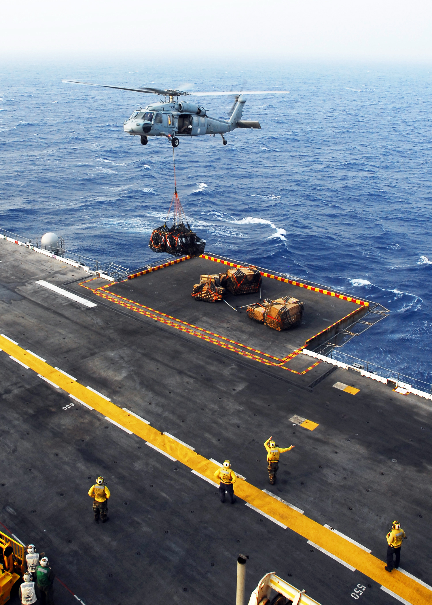 2381k | An MH-60S Sea Hawk helicopter from the "Sea Knights" of Helicopter Sea Combat Squadron Two Two (HSC-22) delivers crates of supplies to USS Peleliu (LHA-5) during a vertical replenishment (VERTREP), 31 August 2008. Peleliu is deployed supporting maritime security operations in the U.S. 5th Fleet area of responsibility. US Navy photo # 080831-N-2183K-043 RED SEA (Aug. 31, 2008) by MC2 Dustin L. Kelling. |