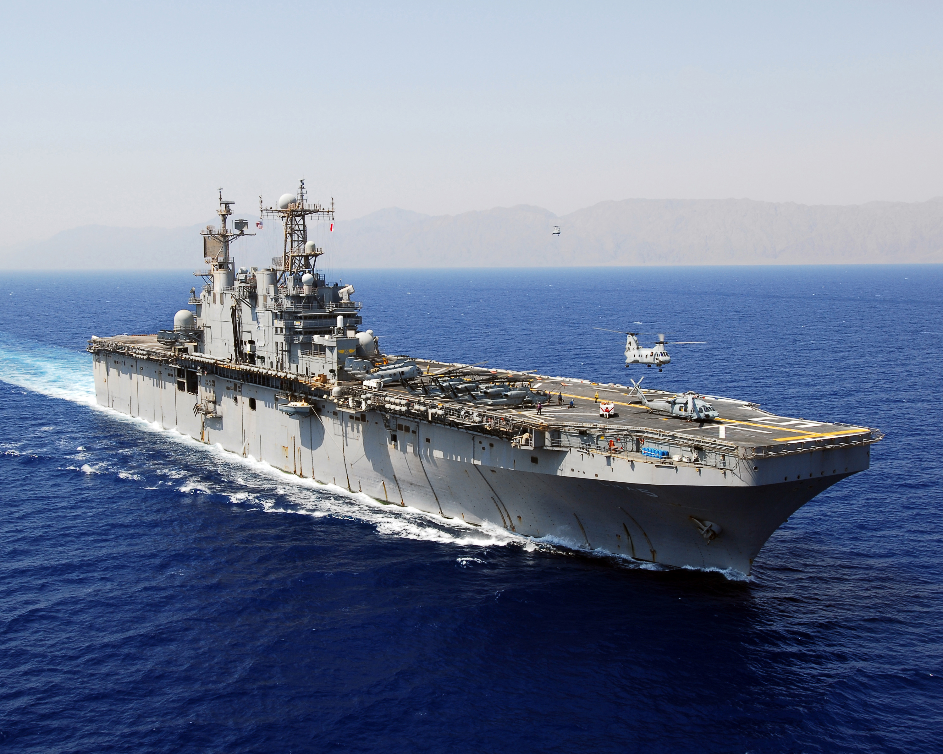 307k | USS Peleliu (LHA-5) transits the Strait of Hormuz after routine operations in the Arabian Gulf. Peleliu is the flagship for the Peleliu Amphibious Ready Group and, with embarked elements of the 15th Marine Expeditionary Unit (15 MEU), is deployed in support of maritime security operations and theater security cooperation efforts in the U.S. 5th Fleet area of responsibility. US Navy photo # 130330-N-AQ172-181 STRAIT OF HORMUZ (March 30, 2013) by MC2 Daniel Viramontes. |