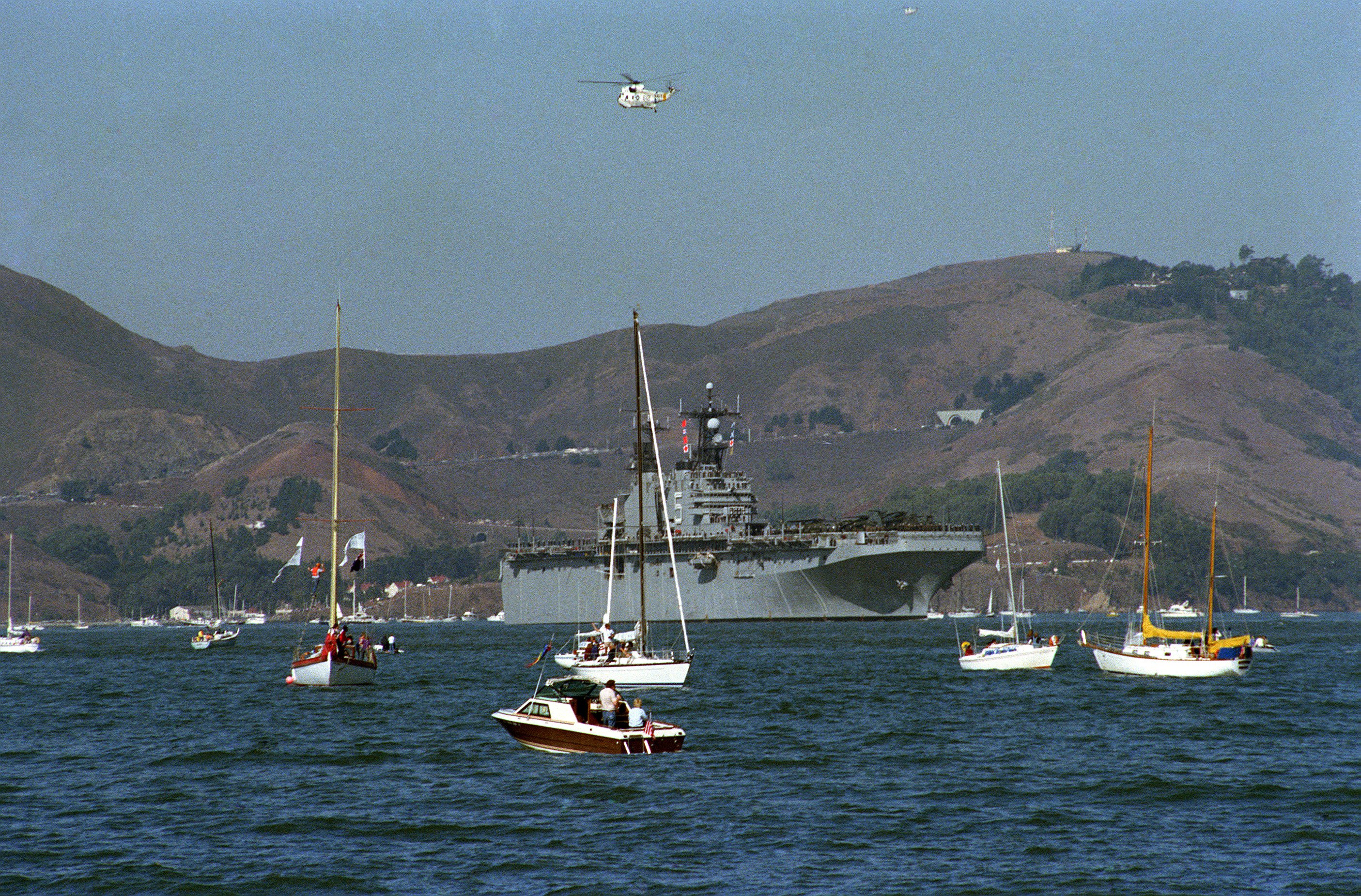1769k | USS Peleliu (LHA-5) passes in review with crewmen manning the rail during the Parade of Ships at Navy Fleet Week '85 activities, 12 October 1985, during the Parade of Ships at Navy Fleet Week '85 activities. DOD photo # DN-SC-86-03204 SAN FRANCISCO BAY (12 October 1985) at US Navy photo by PH3 J.W.R. Oslund, now in the collections of Defense Imagery.mil. |