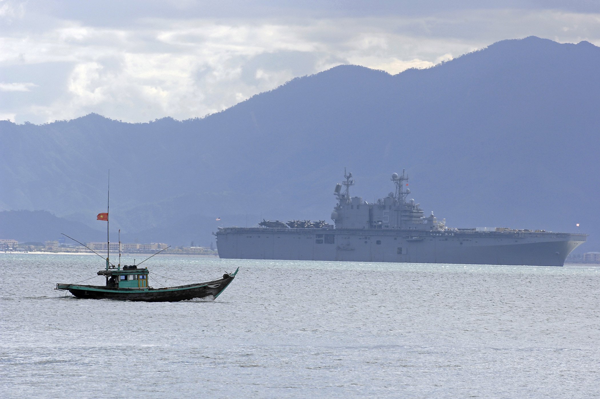 428k | USS Peleliu (LHA-5) anchored in Da Nang Harbor, 17 July 2007, as a Vietnamese fishing boat heads out to sea. Peleliu is at Da Nang in support of "Pacific Partnership", which is a humanitarian assistance mission in Southeast Asia and Oceania that includes specialized medical care and various construction and engineering projects. US Navy photo # 070717-N-4954I-193 Da Nang City, Vietnam (July 17, 2007), by MC3 Bryan M. Ilyankoff, now in the collections of Defense Imagery.mil. |