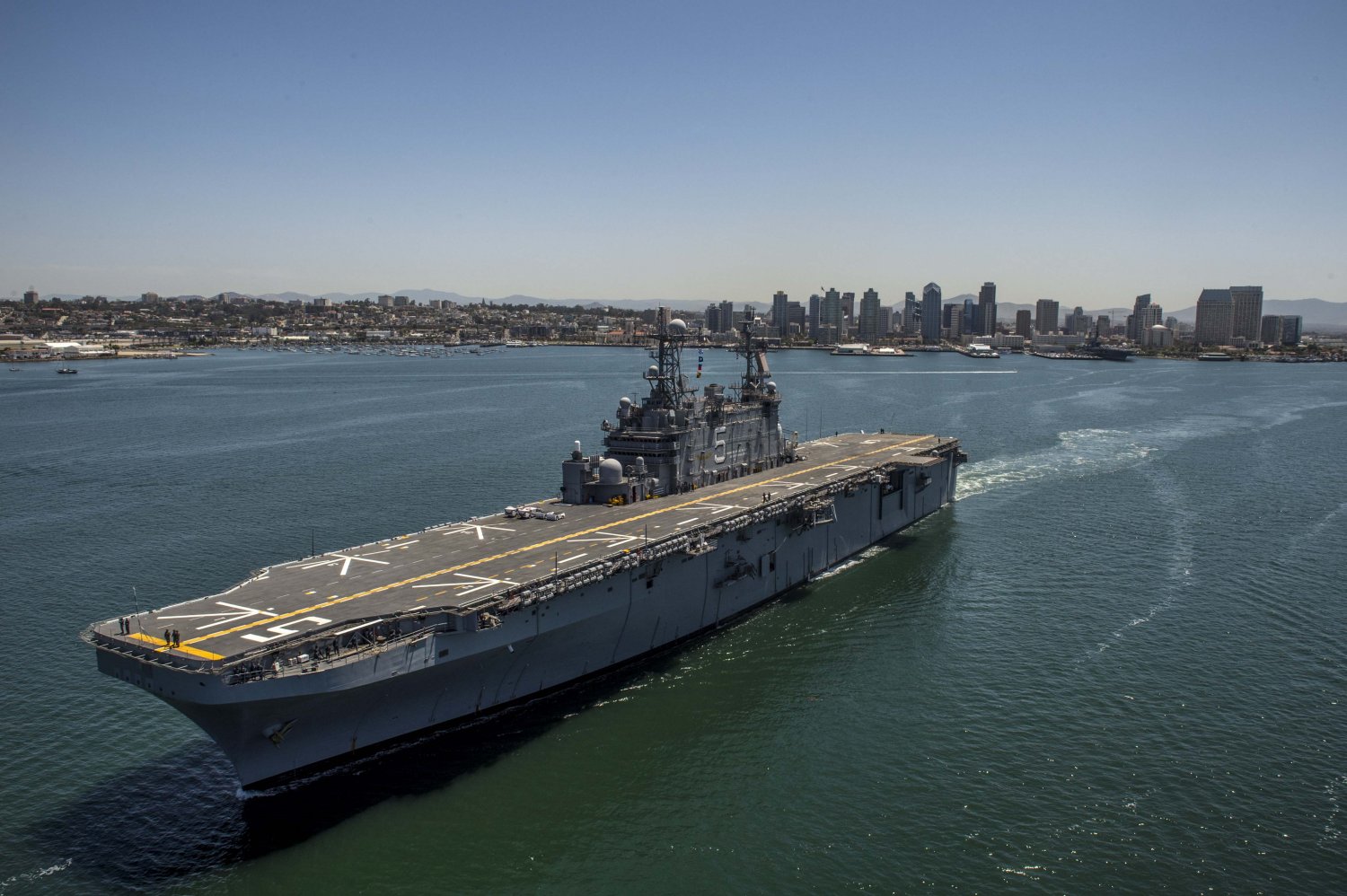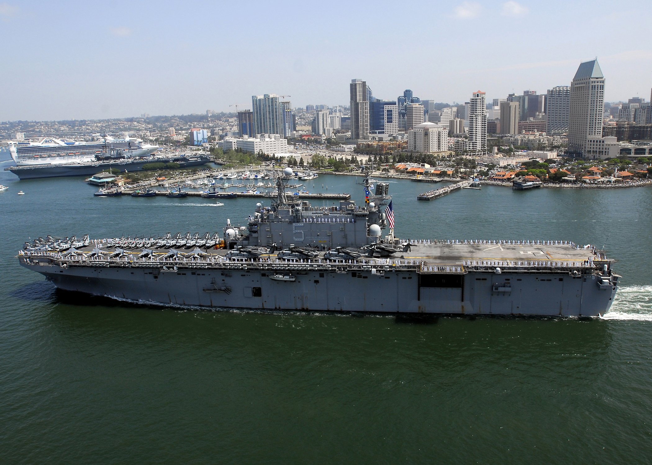 469k | USS Peleliu (LHA-5) returns to Naval Station San Diego, CA., 16 August 2006, following a six-month deployment to the 5th Fleet's area of responsibility. During this deployment the USS Peleliu Expeditionary Strike Group conducted operations in the Persian Gulf. As COMPHIBRON 3's flagship, she completed more than 5,337 flight deck evolutions while in the region, with more than 585 hours in support of Operation Iraqi Freedom (OIF). From Peleliu's deck, AV-8B Harriers assigned to Marine Attack Squadron (VMA) 214 also flew 268 missions into Iraq in support of engaged ground units, oftentimes flying more than 2,400 miles in a single day. US Navy photo # 060816-N-7498L-002 SAN DIEGO BAY (August 16, 2006), by MC3 Mark G. Logico, now in the collections of Defense Imagery.mil. |