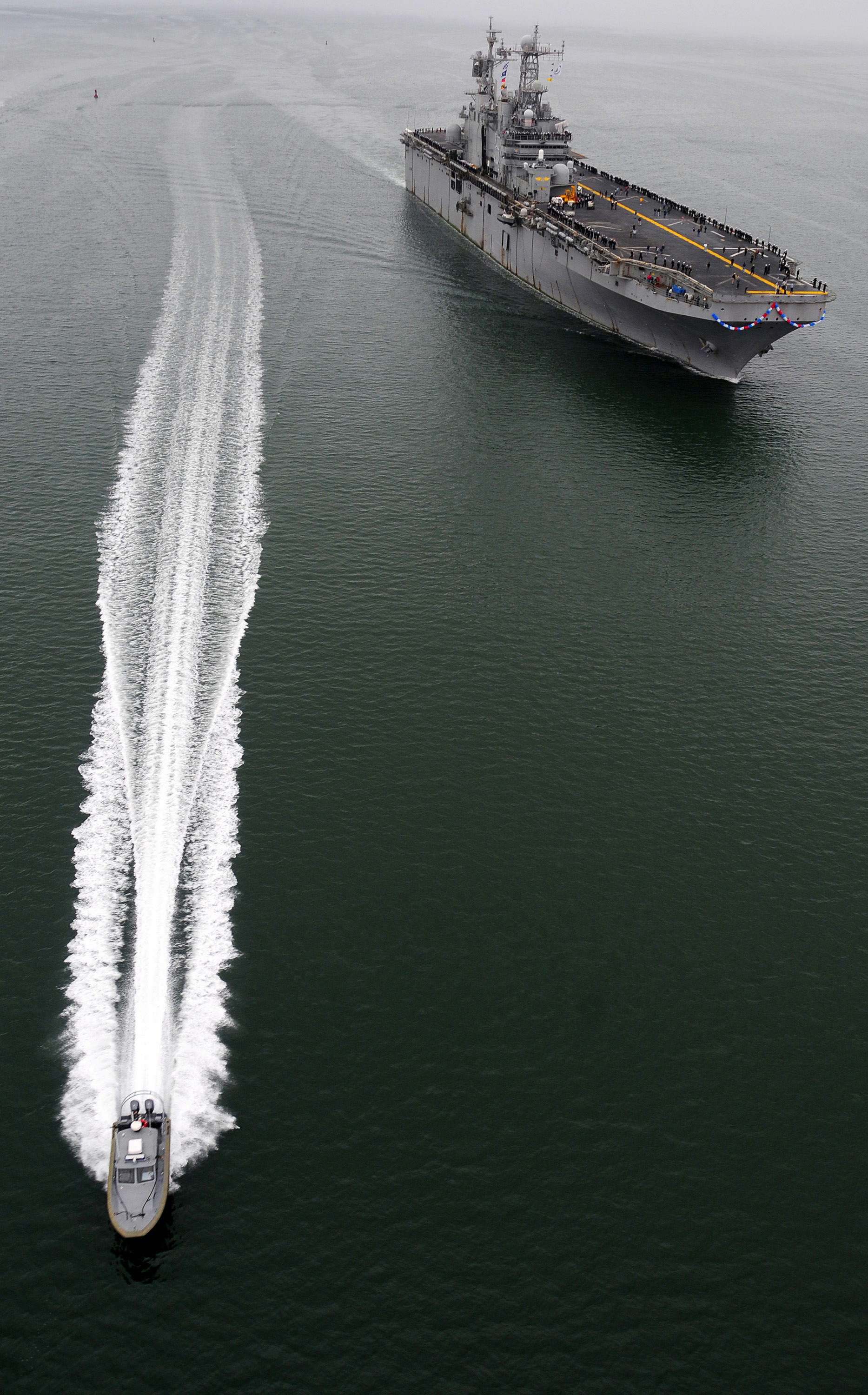1341k | Security boats escort USS Peleliu (LHA-5) as she enters San Diego Bay after completing a six-month deployment to the U.S. 5th and 7th Fleet areas of responsibility. Peleliu, the flagship of the Peleliu Expeditionary Strike Group, deployed in support of U.S. Marine Corps and maritime security operations. US Navy photo # 081104-N-8878B-156 SAN DIEGO (Nov. 4, 2008) by MC3 Michael C. Barton. |