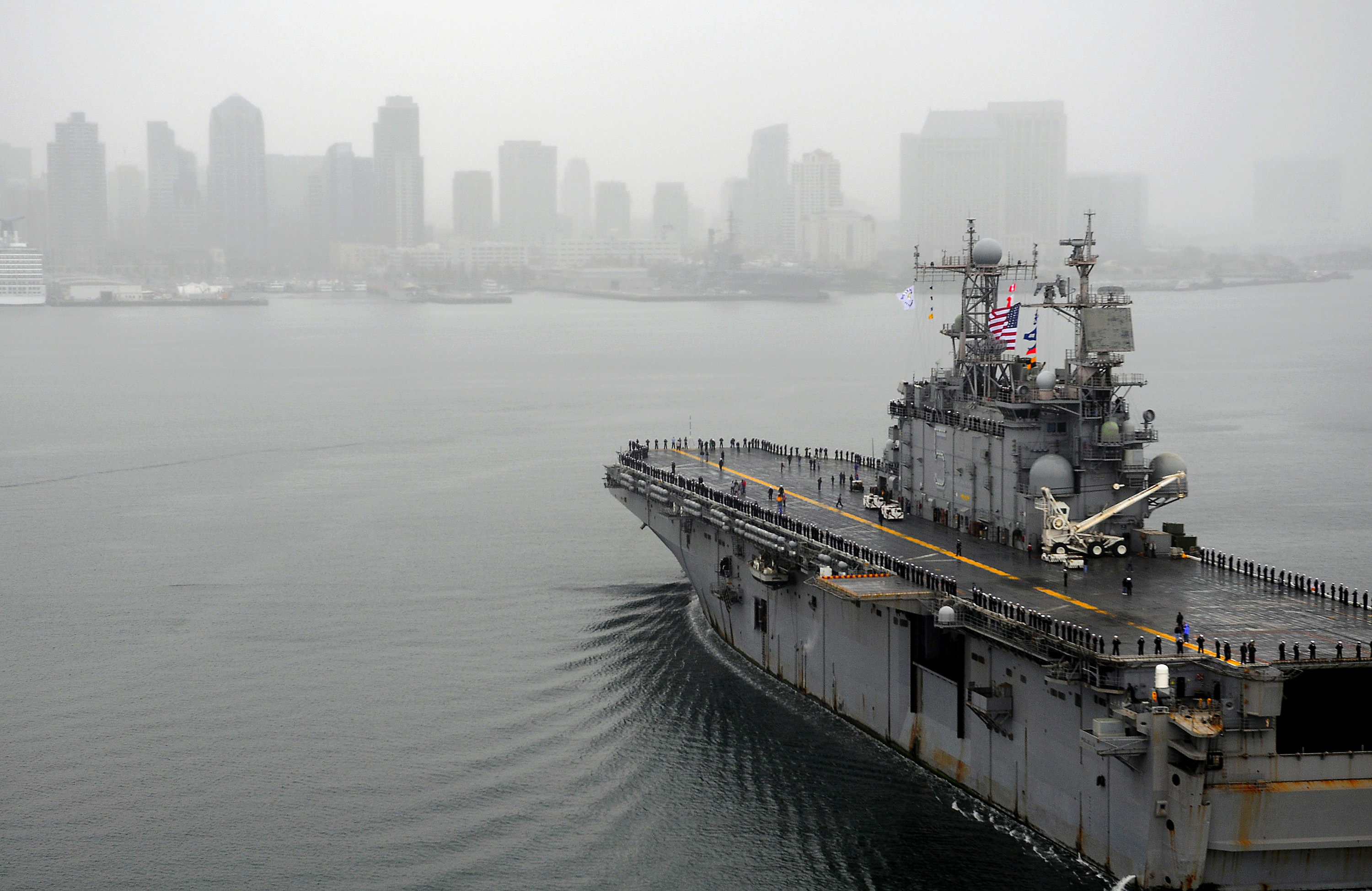 1328k | USS Peleliu (LHA-5) enters San Diego Bay on a foggy morning, after completing a six-month deployment to the U.S. 5th and 7th Fleet areas of responsibility. Peleliu, the flagship of the Peleliu Expeditionary Strike Group, deployed in support of U.S. Marine Corps and maritime security operations. US Navy photo # 081104-N-8878B-252 SAN DIEGO (Nov. 4, 2008) by MC3 Michael C. Barton. |