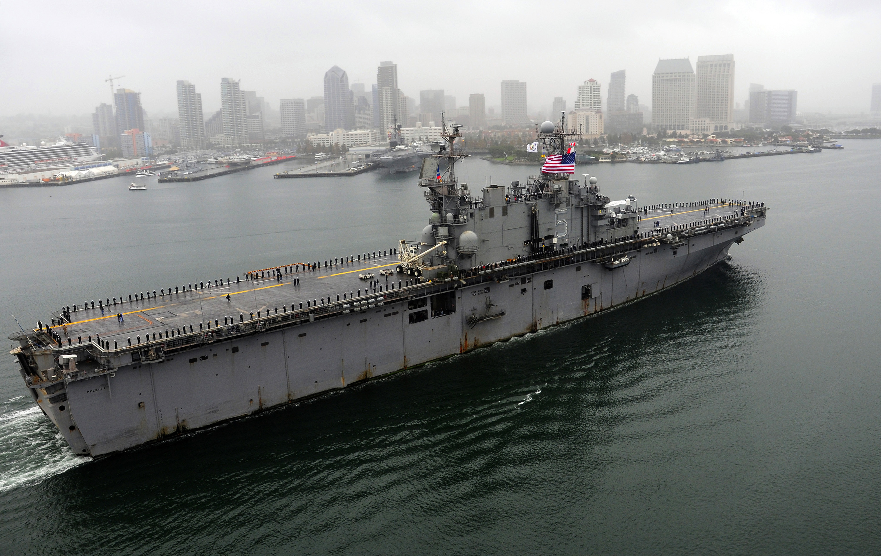 1473k | Sailors man the rail aboard USS Peleliu (LHA-5) as she steams toward her homeport of Naval Station San Diego after completing a six-month deployment to the U.S. 5th and 7th Fleet areas of responsibility. Peleliu, the flagship of the Peleliu Expeditionary Strike Group, deployed in support of U.S. Marine Corps and maritime security operations. US Navy photo # 081104-N-8878B-280 SAN DIEGO (Nov. 4, 2008) by MC3 Michael C. Barton. |