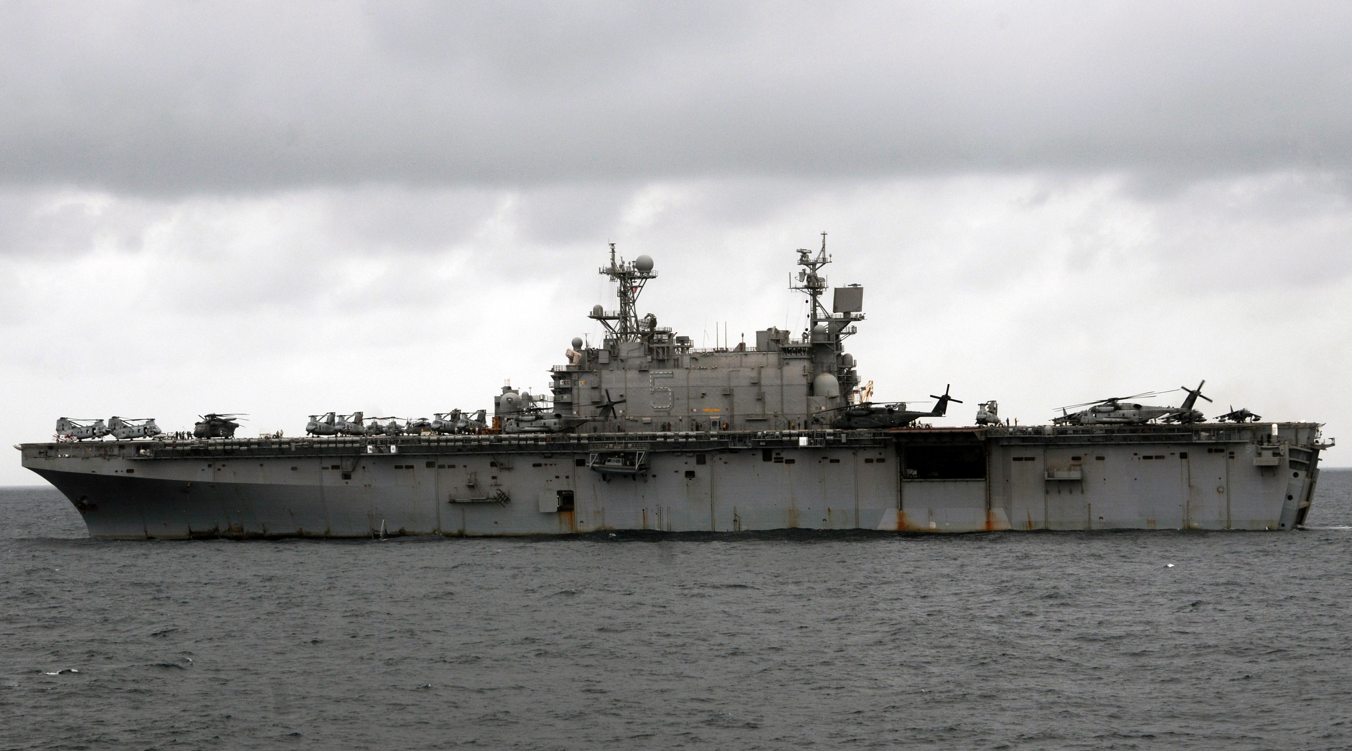 3413k | USS Peleliu (LHA-5) moored pierside in the Middle East, 16 August 2008. Peleliu is deployed in the US 5th Fleet area of responsibility supporting maritime security operations. US Navy photo # 080816-N-3583Z-001 RED SEA (Aug. 16, 2008) by AM3 Yuefeng Zhai. |