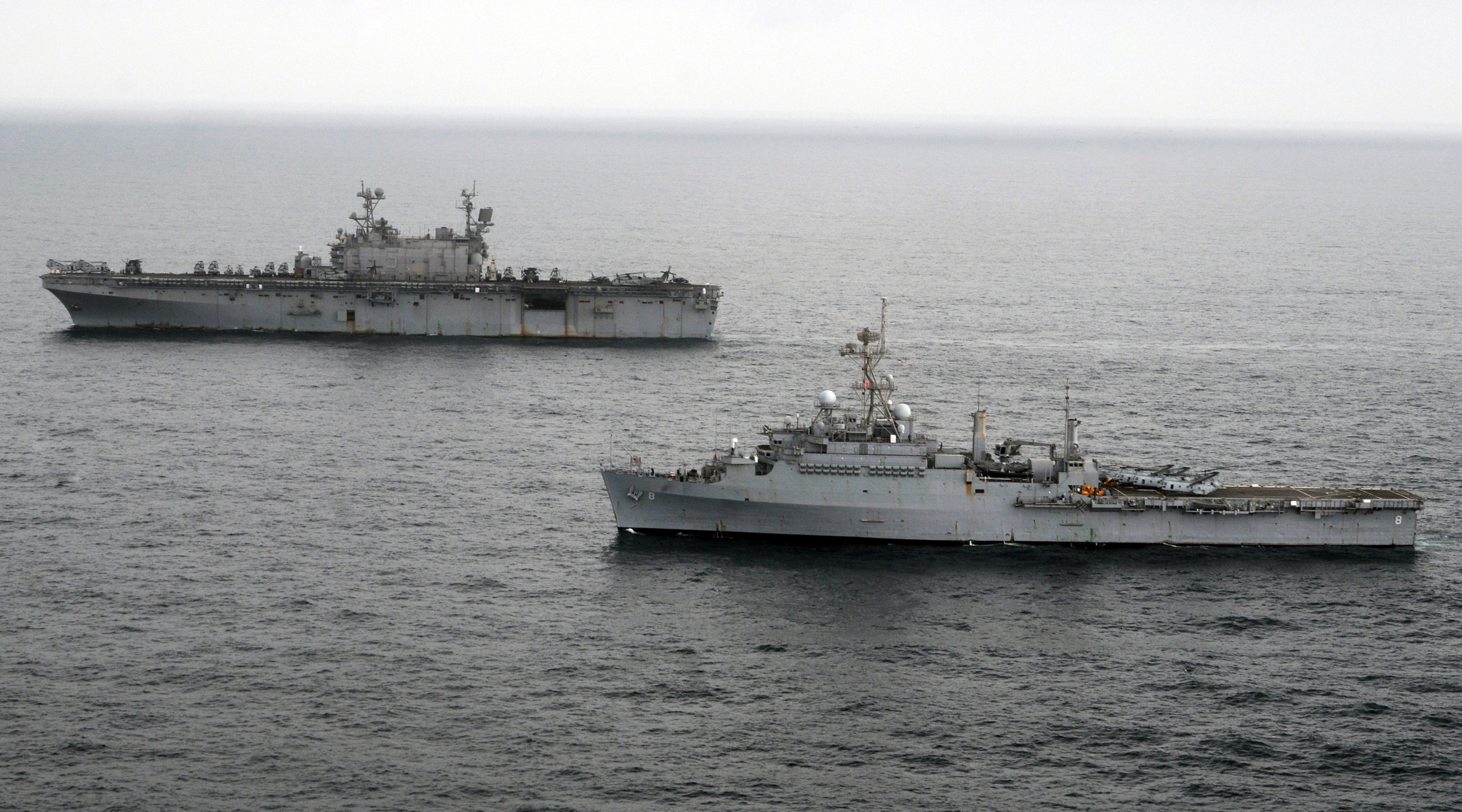 1172k | USS Peleliu (LHA-5) and amphibious transport dock ship USS Dubuque (LPD-8) steam together off the coast of Pakistan, in the early stages of supporting the Pakistani government and military with heavy lift capabilities to bring relief to flooded regions of Pakistan. US Navy photo # 100813-N-VN598-027 Arabian Sea (August 13, 2010) by MC2 Andrew Dunlap. |
