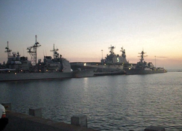 50k | USS Peleliu (LHA-5) moored pierside at Naval Station San Diego at sunset in January 2009. Also moored near by is a Ticonderoga class Guided-Missile Cruiser and an Arleigh Burke class Guided Missile Destroyer, both unidentified. | Richard Miller BMCS USNR (Ret) | |