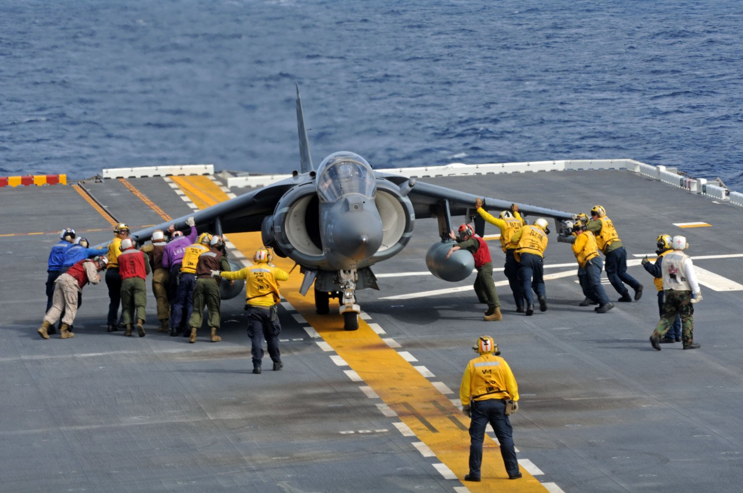 10070580 (140327-N-AQ172-155) | 239k | Sailors and Marines move and direct an AV-8B Harrier assigned to the "Avengers" of Marine Attack Squadron (VMA-211) into position during flight operations aboard the amphibious assault ship USS Peleliu (LHA 5). Peleliu is conducting flight deck certification following completion of a seven-month maintenance availability in preparation for a future deployment. US Navy photo #'s 140327-N-AQ172-155 PACIFIC OCEAN (March 27, 2014) , 140327-N-AQ172-037 PACIFIC OCEAN (March 27, 2014) and 140327-N-AQ172-204 PACIFIC OCEAN (March 27, 2014)by MC2 Daniel Viramontes. |