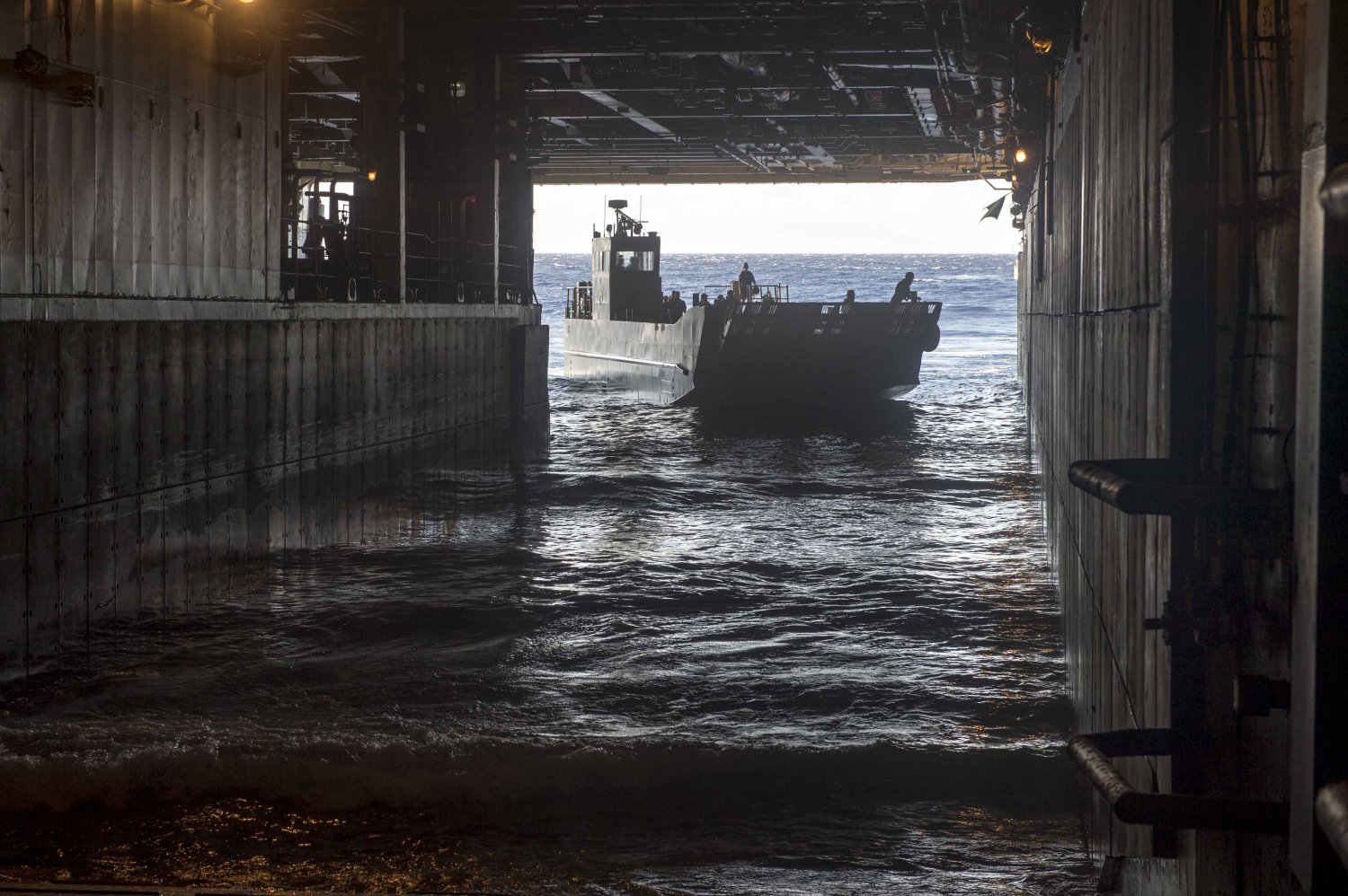 279k | A Royal New Zealand Navy landing craft (LCM) enters the well deck of USS Peleliu (LHA-5) while conducting personnel-transfer operations during Rim of the Pacific (RIMPAC) Exercise 2014. Twenty-two nations, 49 ships, six submarines, more than 200 aircraft and 25,000 personnel are participating in RIMPAC from June 26 to Aug. 1, in and around the Hawaiian Islands and Southern California. US Navy photo # 140718-N-SU278-062 PACIFIC OCEAN (July 18, 2014) by MC2 Will Gaskill |