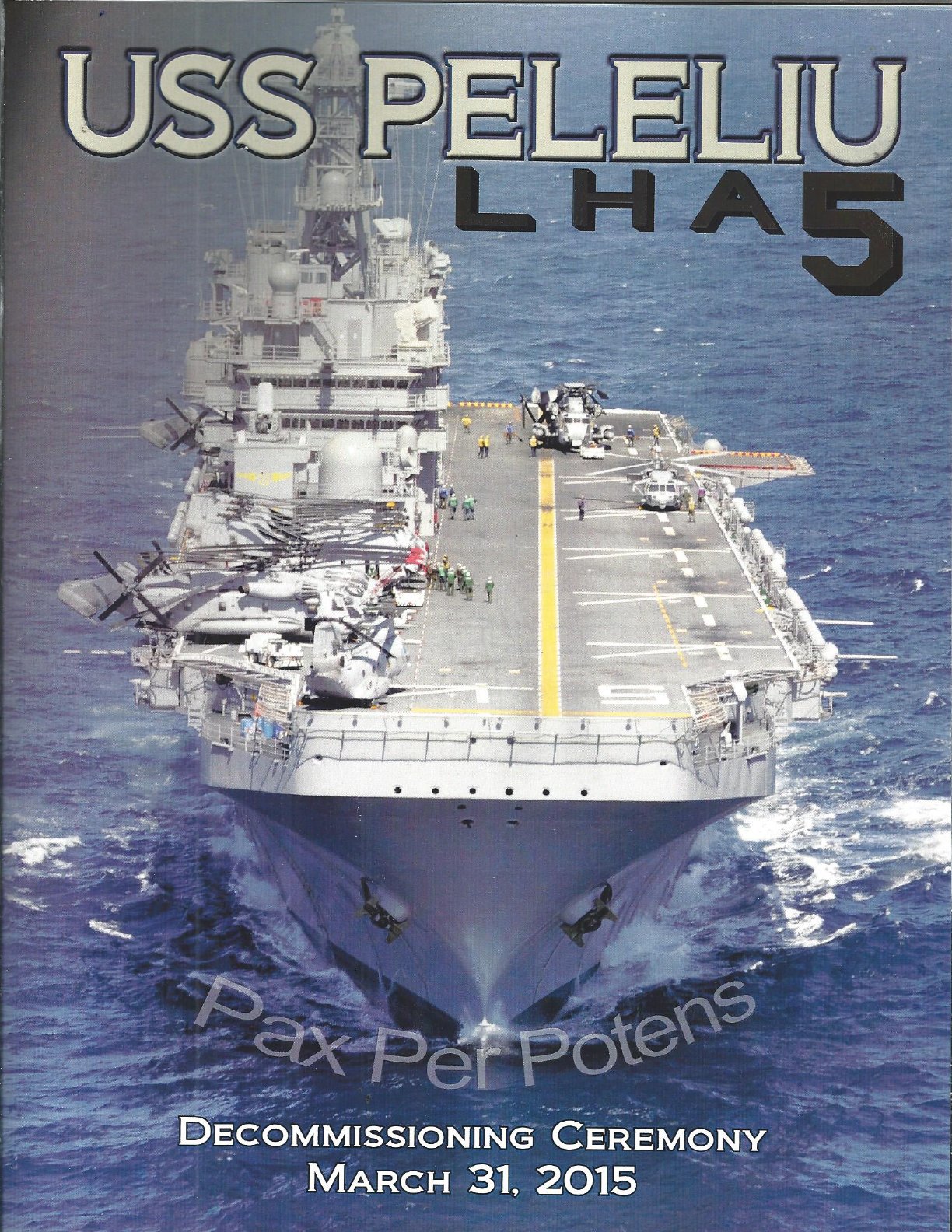 519k | Cover of the 31 March 2015 Decommissioning Ceremony booklet for USS Peleliu (LHA-5). | Ron Reeves | |