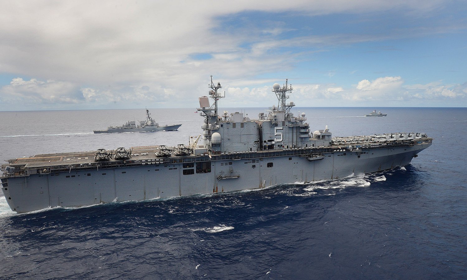 232k | USS Peleliu (LHA-5) leads the amphibious transport dock ship USS Green Bay (LPD-20) and the amphibious dock landing ship USS Rushmore (LSD-47) during a transit of the Pacific Ocean. US Navy photo # 130423-N-ZM744-177 PACIFIC OCEAN (April 23, 2013) by MC3 Michael Duran. |