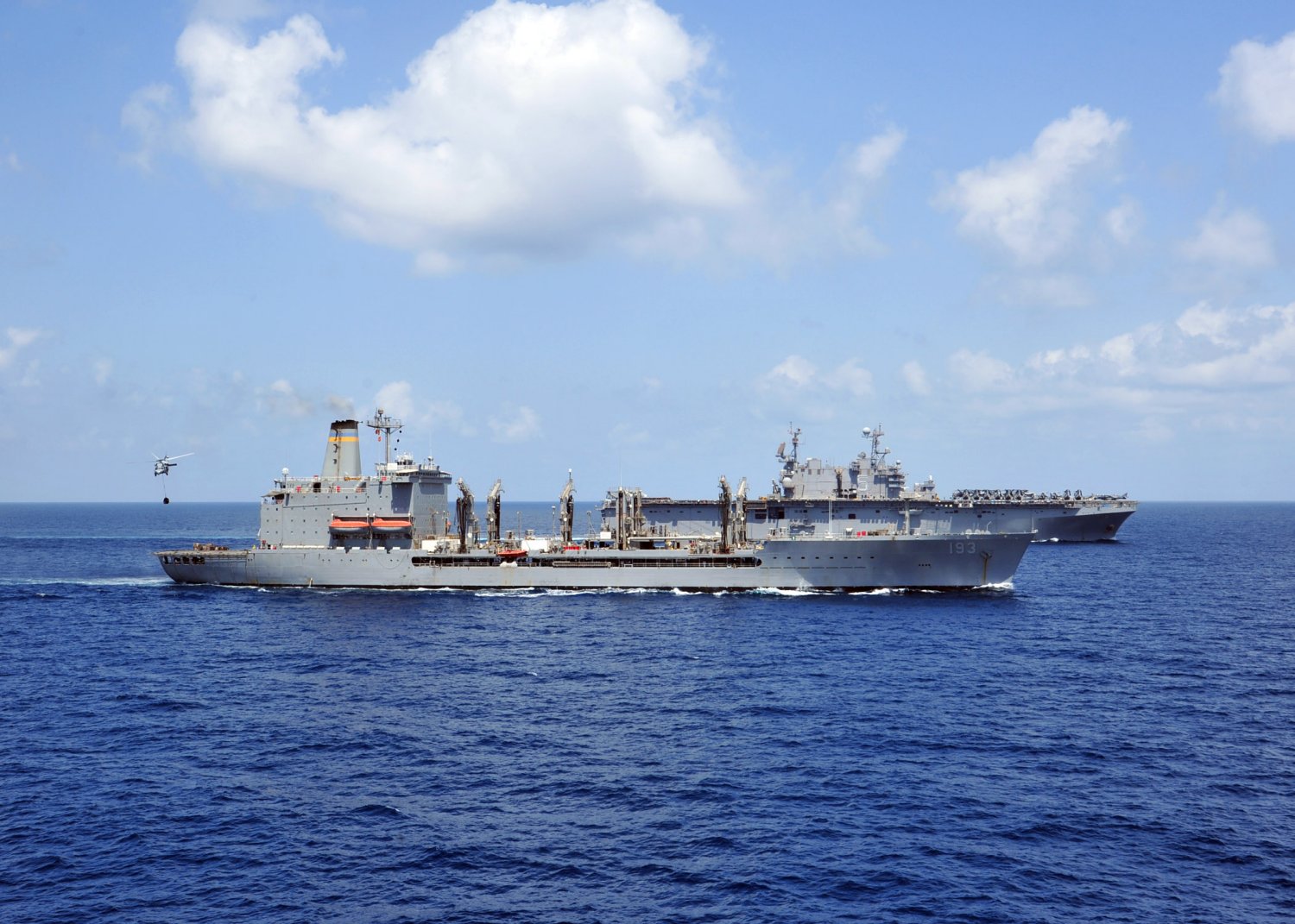 263k | The Military Sealift Command fleet replenishment oiler USNS Walter S. Diehl (T-AO-193) is underway alongside USS Peleliu (LHA-5) during a replenishment-at-sea. Peleliu is the flagship of the Peleliu Amphibious Ready Group, with the embarked 15th Marine Expeditionary Unit (15th MEU), and is deployed in support of maritime security operations and theater security cooperation efforts in the U.S. 5th Fleet area of responsibility. US Navy photo # 130401-N-YQ852-089 U.S. 5TH FLEET AREA OF RESPONSIBILITY (April 1, 2013) by MC2 Shawnte Bryan |