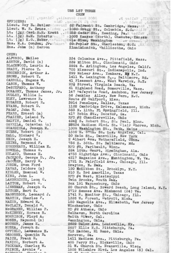 Aboard USS LST-3, William R. Bruce (left), J.H. Herron (center), Lt. Bruce E. Roberts (right). |