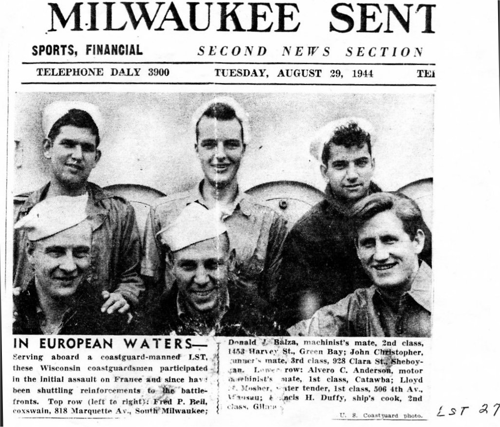 220k | Newspaper article with photo of Wisconsin USS LST-27 crew members. | Timothy Duffy for his father Francis Duffy USS LST-27 | |
