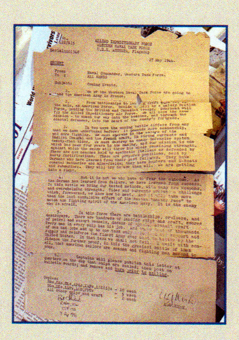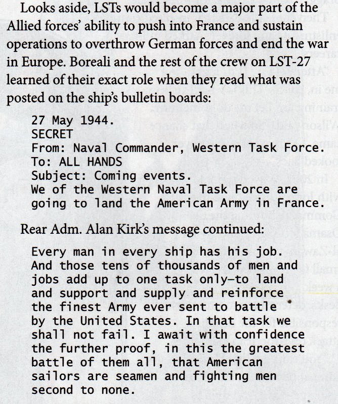 | From DAV (Disabled American Veterans) Magazine Julius J. Boreali Diary and Ltr. from RADM Alan Kirk Commander Western Task Force to All Hands |