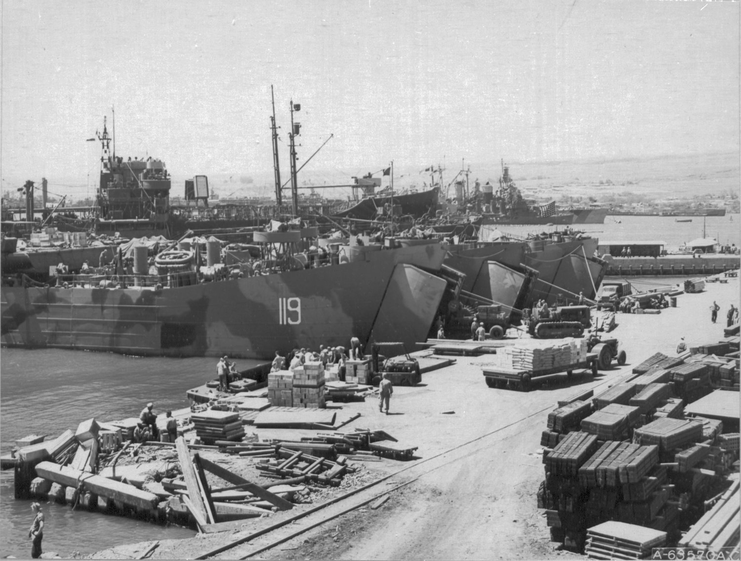 212k | USS LST-119 and USS LST-40 loading the equipment of the US Army Air Corps 804th Engineering Aviation