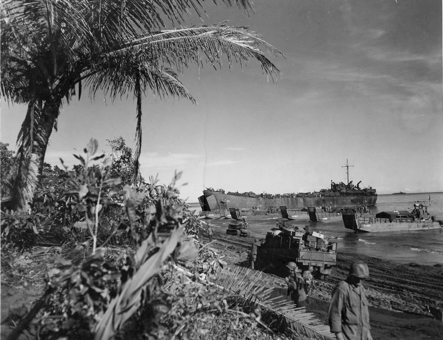 510k | USS LST-66 disembarking troops while beached at Red Beach #2, Tanah Merah Bay, Dutch New Guinea (Hollandia Operation),