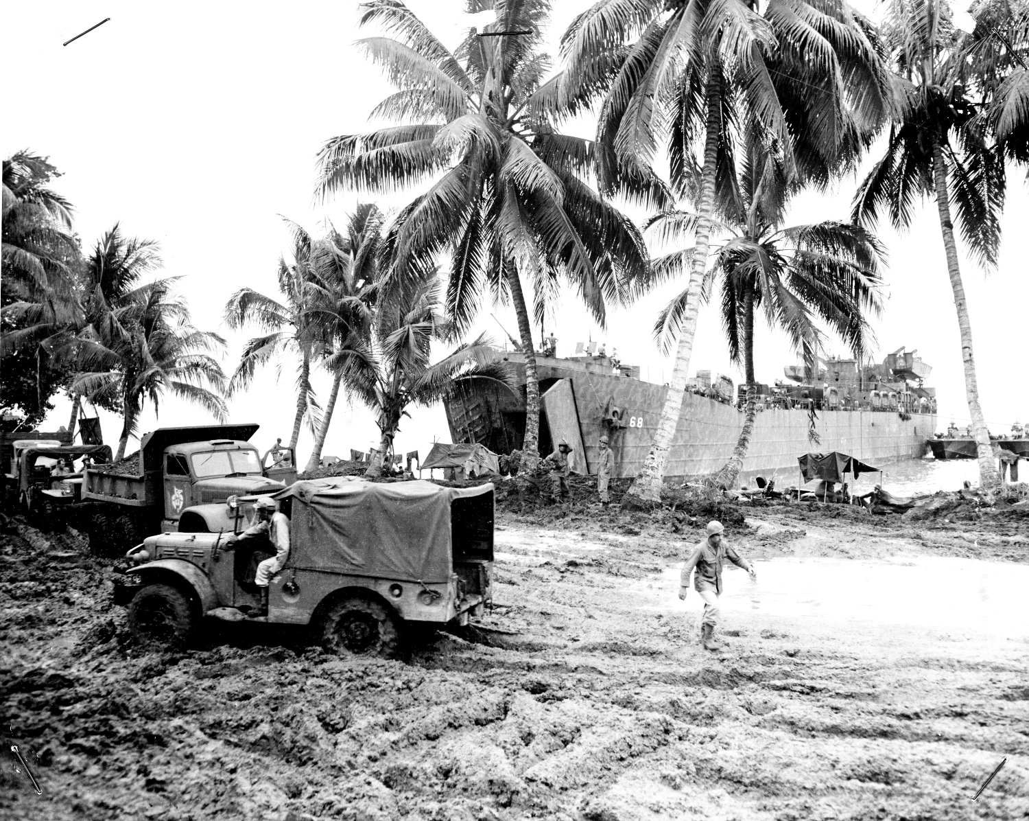 quagmire. Trucks rolled down the ramp to struggle through the slime. Mud seems to be linked with war - even in the palmy South Seas. Note the torpedo boats alongside,