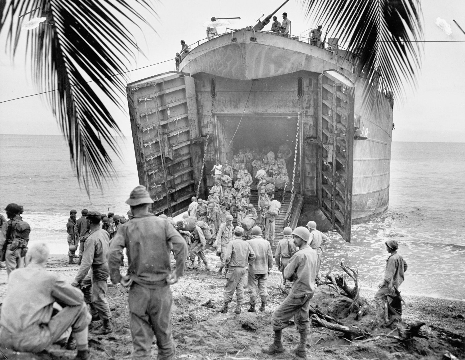 122k | US Army 40th Infantry Division troops wade ashore from USS LST-68 at Panay Island, Philippines, date unknown. US Army Signal Corps photo. |