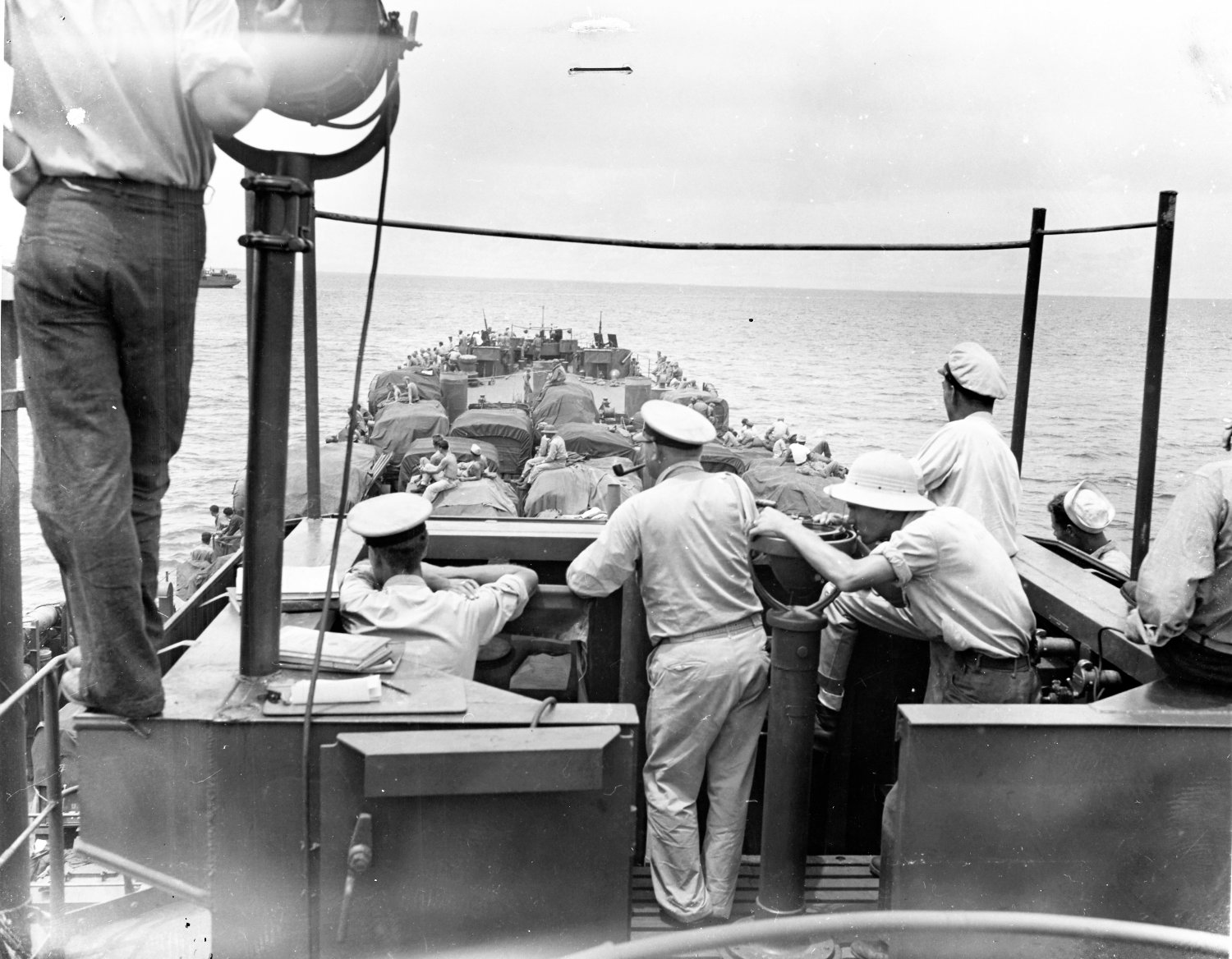 beaches of Luzon. Close in the wake of the LST's, riding low with heavy cargoes of supplies on the horizon are transports and more LSTs moving forward under a leaden sky."