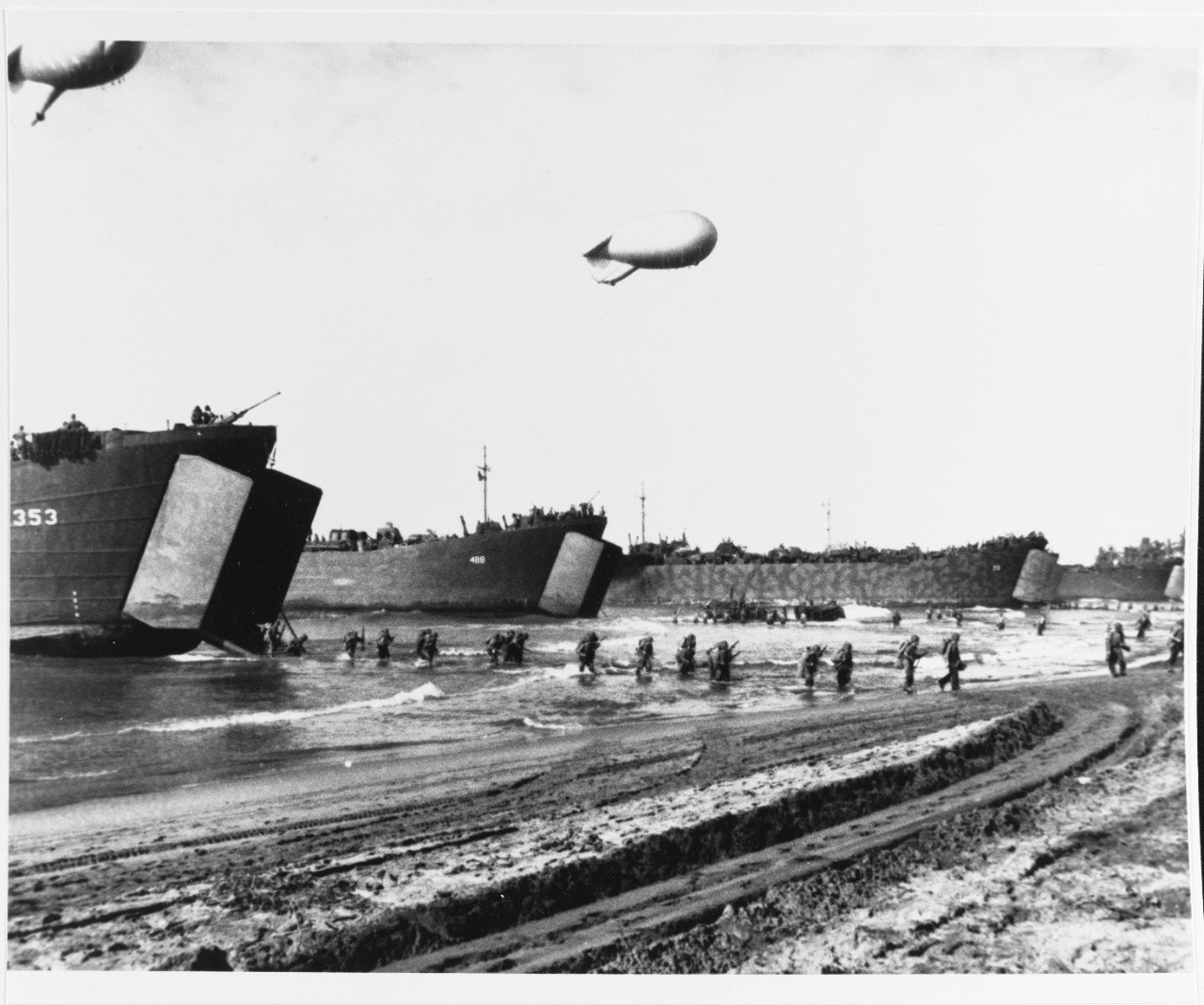 are USS LST-488 and USS LST-70. Note barrage balloons overhead.