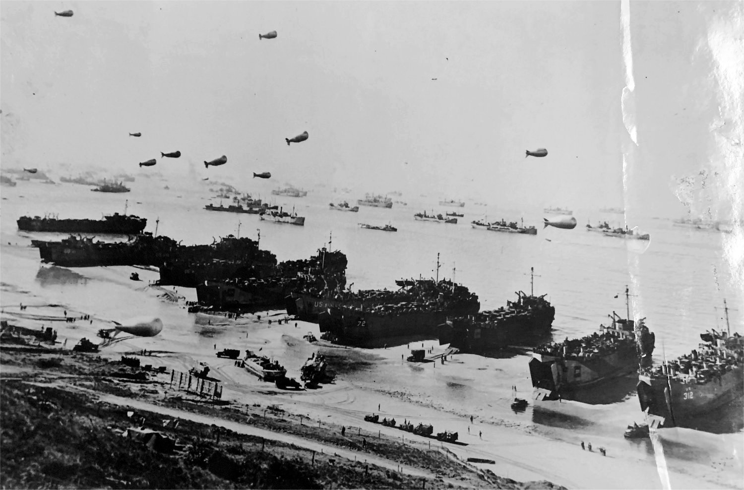 370k | LSTs land invasion supplies on "Utah" Beach, shortly after the 6 June 1944 "D-Day" assault. LSTs on the beach include from (right to left): USS LST-312 HM LST-320 HM LST-321 USS LST-72 USS LST-51? last digit not visible) HM LST-324 USS LST-311 USS LST-49 USS LST-373 USS LST-47 and two unidentified LSTs. Note: bow numbers of the British ships enclosed in colored blocks; crowd of shipping offshore; barrage balloons over many of the ships. Photo was released for publication, 23 October 1944 US National Archives photo # 80-G-46817 a US Navy photo now in the collections of the US National Archives. Note: This image is labeled as Omaha Beach but is actually taken on Utah Beach. [See - The movie "A Newsreel Camaraman's View if D-Day" in color by Jack Lieb. About 15 minutes into the film Jack Lieb pans the beach one can see that this is Utah Beach showing LSTs 72, 324, 311, 46, 47 in the same sequence as in the NARA photo 80-G-46817.] |