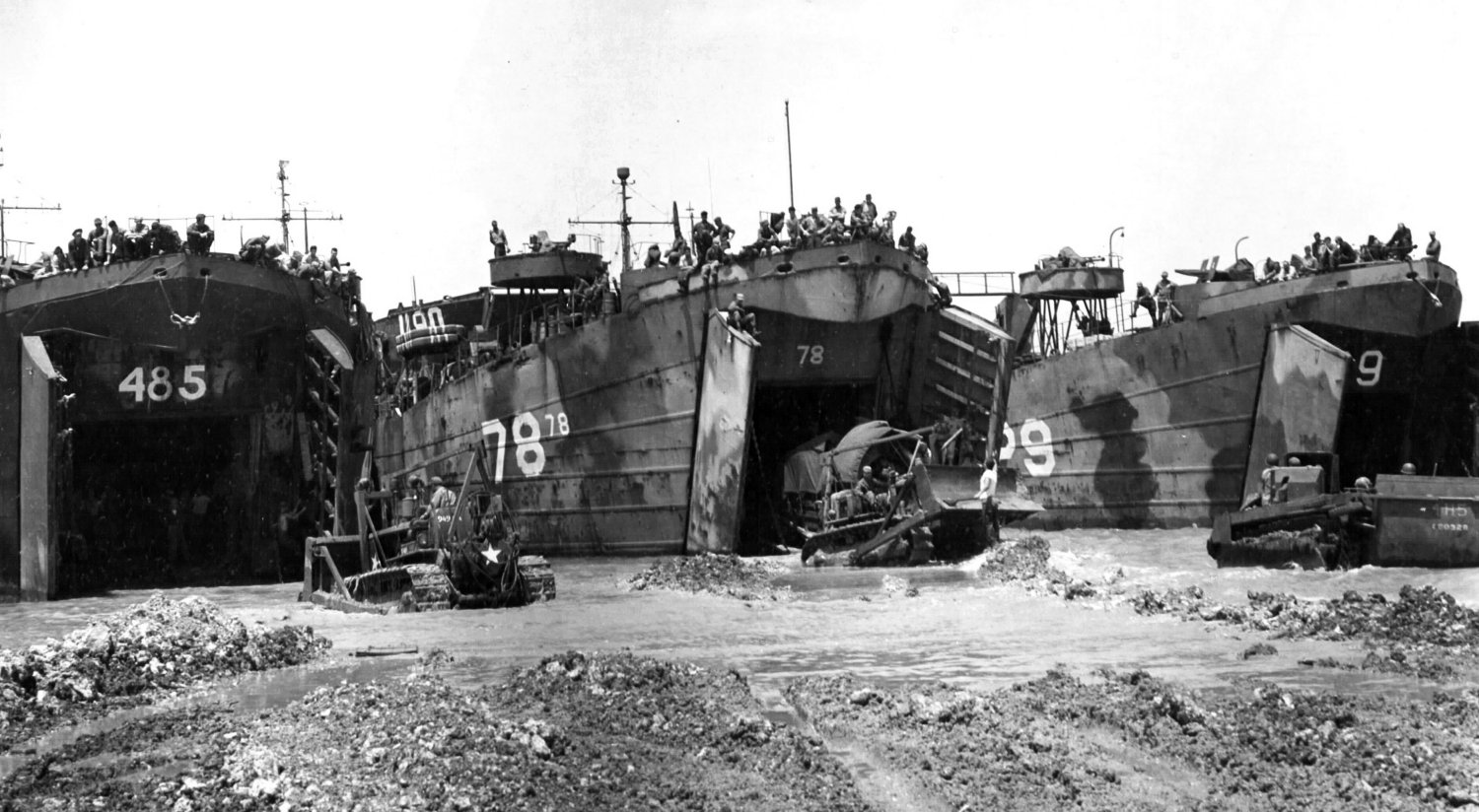 301k | US Army soldiers unloading gasoline drums from USS LST-179 and USS LST-78 during landing operations on
