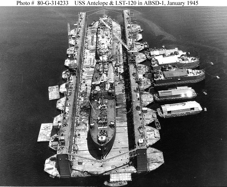 150k | USS LST-120 astern of USS Antelope (IX-109) in Floating Drydock USS ABSD-1 at Espiritu Santo, New Hebrides, 8 January 1945. US National Archives photo 80-G-324233, a US Navy photo now in the collections of the US National Archives |