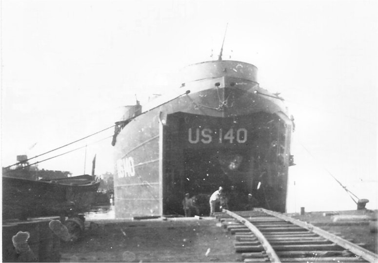 45k | USS LST-140 preparing to load railroad cars at Oran, Algeria for delivery to Marseilles, France. | Wesley E. Reed QM2/c USS LST-140 | |