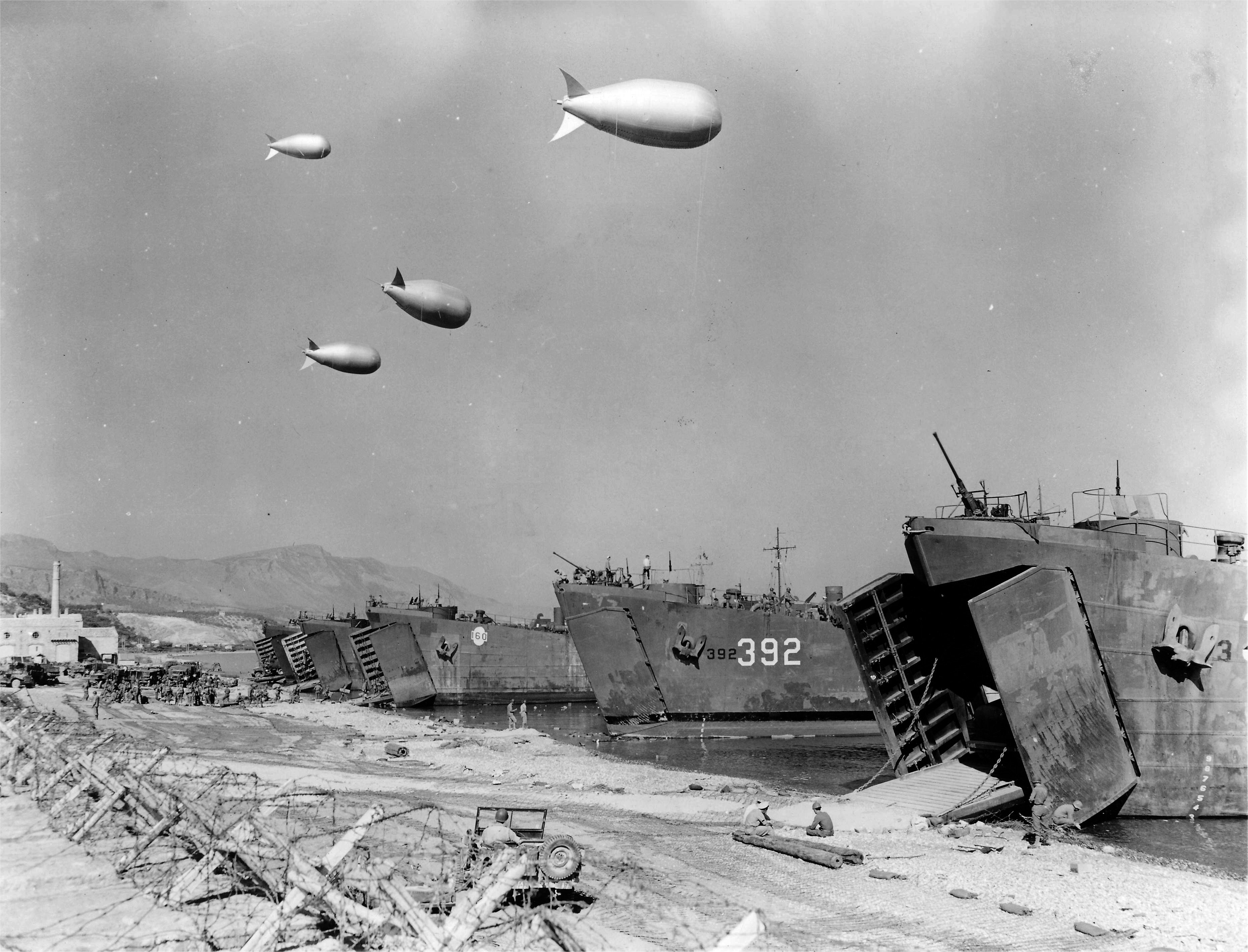 1560k | HM LST-160 and USS LST-392 beached on the beach side of the breakwater at Termini-Imerese, Sicily, 13 September 1943 while loading reinforcements for the American 5th Army during the Salerno landing campaign. US National Archives photos # III-SC 182816, Box 187 and III-SC 182819, Box 187, US Army Signal Corps. photo now in the collections of the US National Archives. |