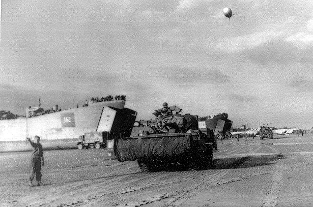 66k | USS LST-175 unloading a lorry on the Normandy beaches, 7 June 1944. Note barrage balloon overhead and unidentified LST high and dry.