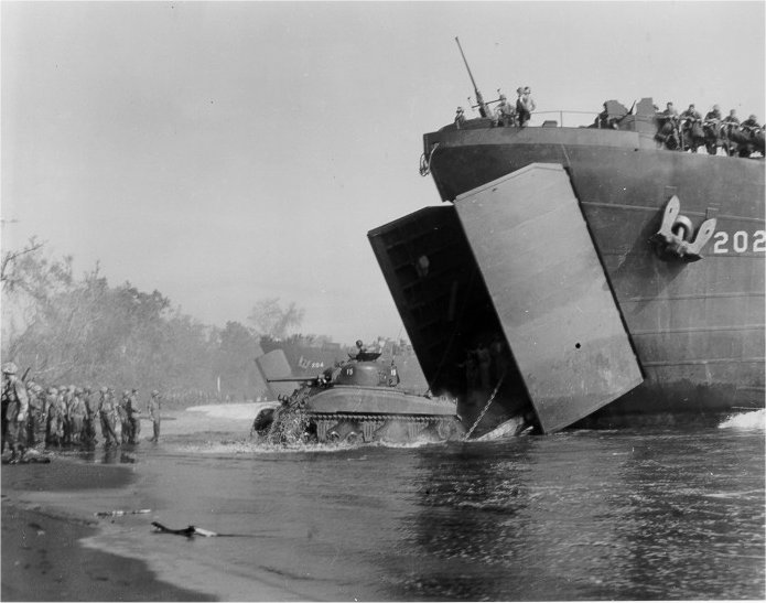 284k | An M4 Sherman Tank rolls down the ramp of USS LST-202 at Cape Gloucester on New Britain Island, circa 26 December 1943.