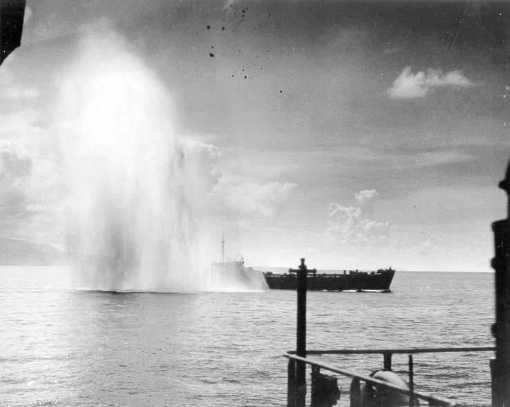 80k | USS LST-202 under attack, date and location unknown. US Coast Guard photo from the US Coast Guard Historian's Office. |