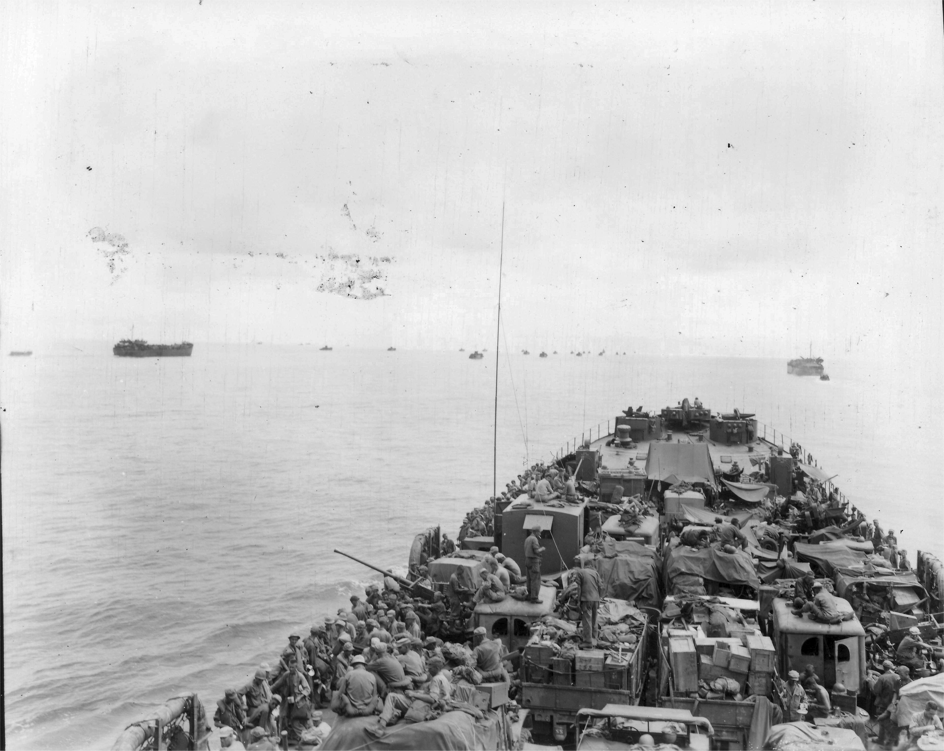 953k | Invasion task force as seen from USS LST-202 in Maffin Bay, Dutch New Guinea, 30 July 1944. US National Archives photo # III-SC 261039, a US Army Signal Corps. photo by, now in the collections of the US National Archives. |