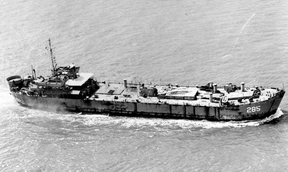 70k | USS LST-285 moored at the artificial harbor at Normandy, June 1944. US National Archives image |