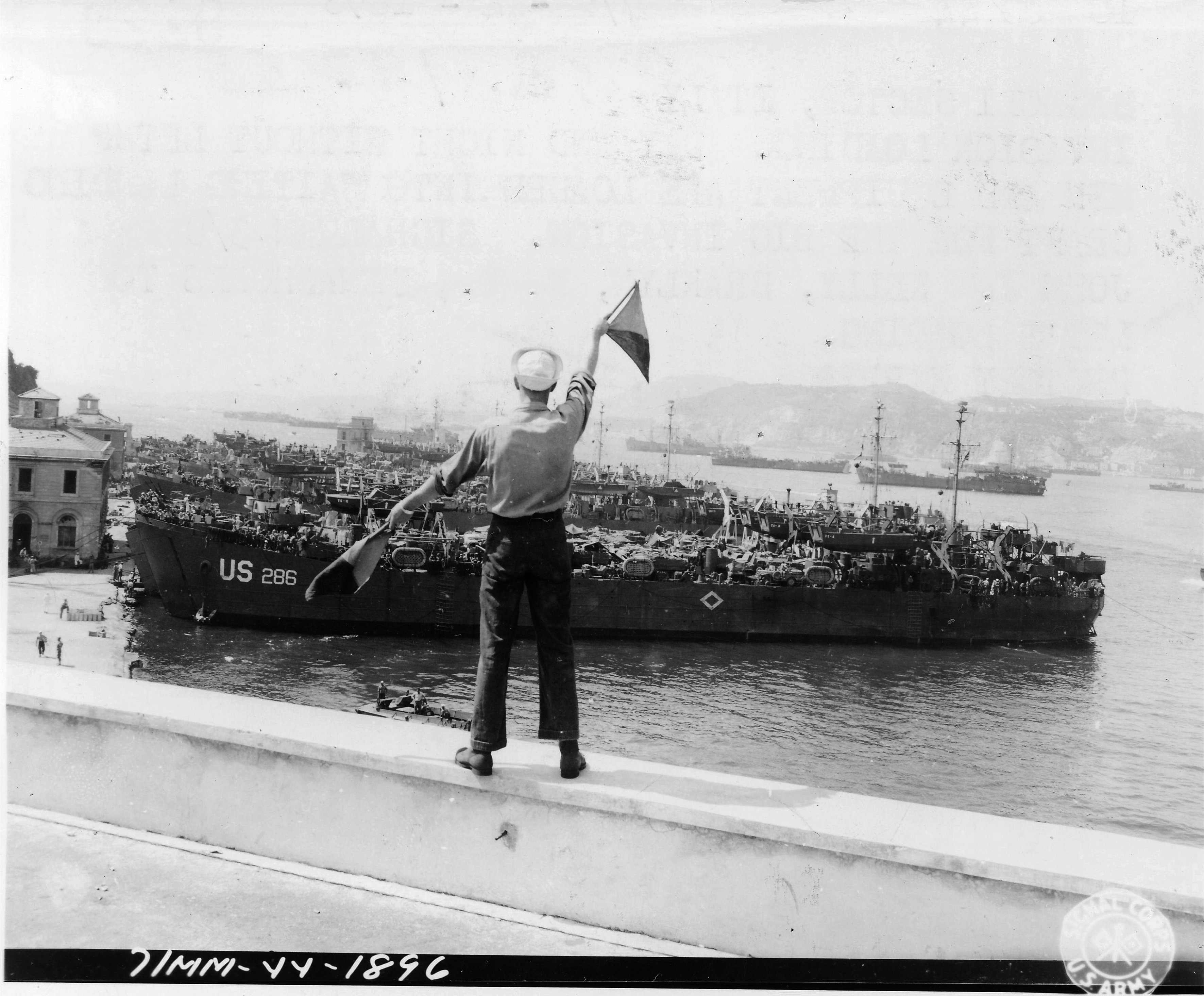 1095k | USS LST-286 with other LSTs invasion loading in the Bagnoli sector, Italy for the invasion of southern France. SM3/c John J. Kelly, Brooklyn, N.Y. semaphores to ships in the harbor, 10 August 1944. US Army Signal Corps photo # SC 192559-S, 4 September 1944 by Harris 163 Sig. Photo Co. |