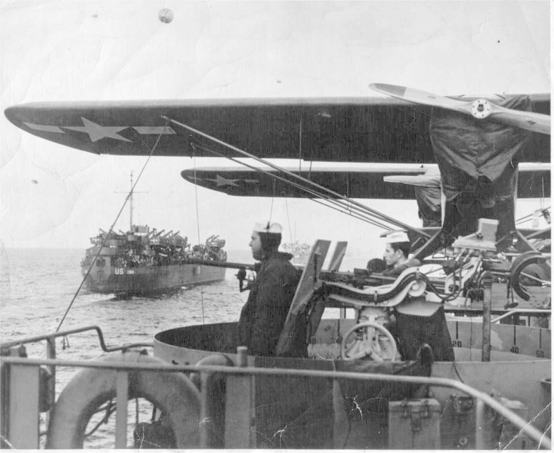 88k | USS LST-286 underway while enroute to the invasion of southern France, circa August 1944. Note the barrage balloon overhead and the Piper Cub aircraft on the deck of the LST the photo was shot from. Photo Caption reads: "LSTs as 'Junior Aircraft Carriers' Adding another function to its long list, the versatile LST (Landing Ship Tank) played the role of 'junior carrier' in the Invasion of Southern France on August 15 1944, launching tiny Piper CUBS to act as spotters for naval gunfire. A specially-adapted runway is installed for the aerial operation. A gunner keeps an alert lookout as an LST carrier moves in toward France on D-Day. US Navy photo file number: 242690, Released 11 September 1944. |