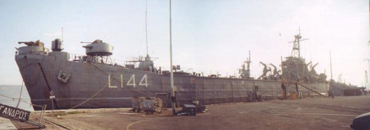 96k | Ex USS LST-325 now in service as the Greek HS Syros (L-144) approaching the beach during a Royal Hellenic Navy amphibious operation, circa 1969. The stern of the LSM HS Ipopliarchos Tournas (L-162), formerly USS LSM-102 is visible at the extreme left. US Navy photo # NH 97466, from the collections of the US Naval Historical Center |