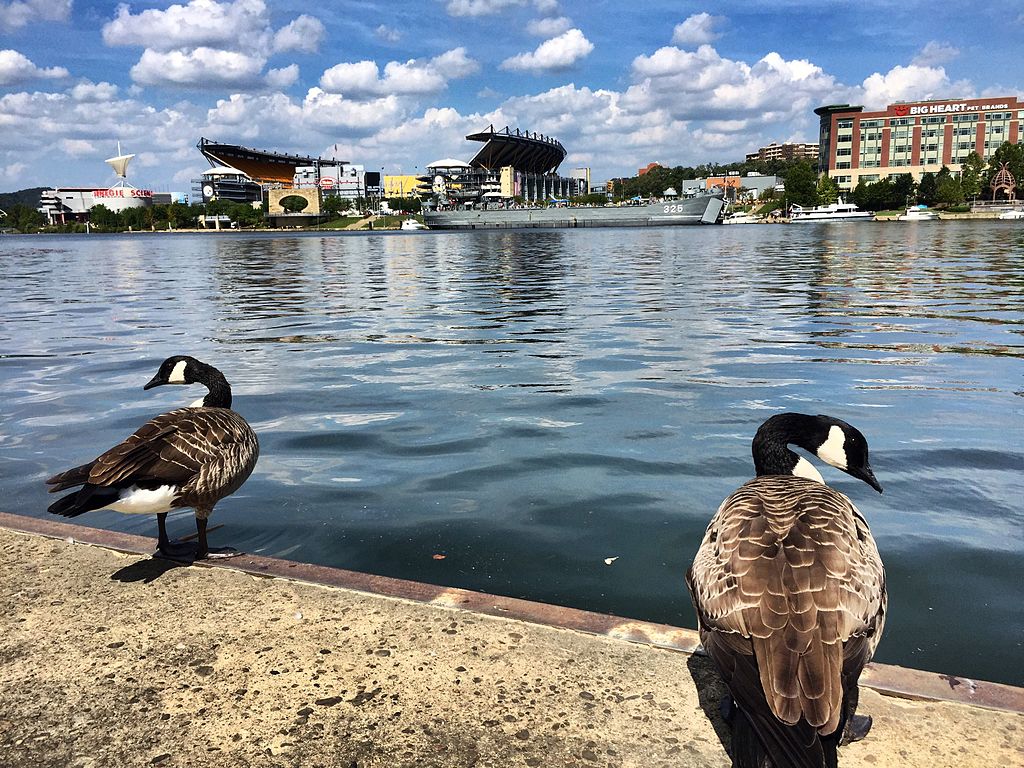 237k | LST 325 moored pierside on the Allegheny River at North Shore, Pittsburhg, PA., 8 September 2015. Note two geese and Heinz Field.