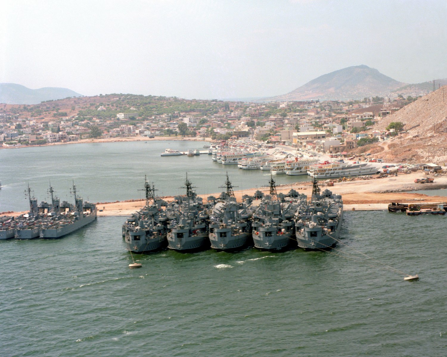 340k | Greek amphibious ships moored at the Salamis Naval Base, Greece, 31 August 1979. From left to right: Ex-USS LSM-399 - HS Ipopliarkhos Roussen (L-164) Ex-USS LSM-45 - HS Ipopliarkhos Grigoropoulos (L-161) Ex-USS LSM-102 - HS Ipopliarchos Toyrnas (L-162) Ex-USS Potter County (LST-1086) - HS Ikaria (L-154) Ex-USS Page County (LST-1076) - HS Kriti (L-171) Ex-USS Boone County (LST-389) - HS Lesbos (L-172) Ex-USS Bowman County (LST-391) - HS Rodos (L-157) Ex-USS LST-325 - HS Syros (L-144) Defense Imagery Photo # VIRIN: DN-SC-82-00333 by PHC C. Pedrick USN. |