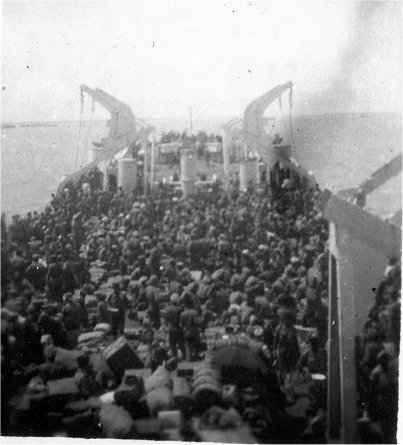 37k | Troops crowd the main deck of HM LST-326 while underway, date and location unknown. | Able Seaman Alan Rolls Royal Navy HM LST-326 and Colin E C Pilcher Flt Lt RAF (retired) for his father LCDR. Leonard George Pilcher RNVR Commanding Officer HM LST-326 | |
