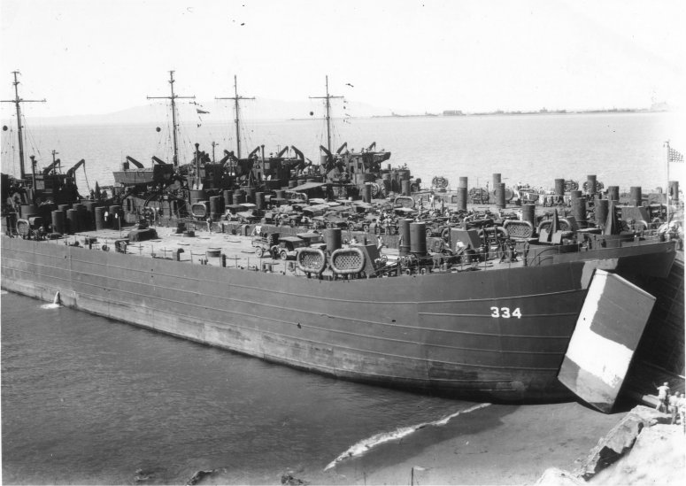 78k | USS LST-334 and three additional LSTs beached while loading troops, supplies and vehicles at Kissing Point, Port Townsville, Australia, date unknown. | Peter Dunn and Joe Radigan MACM USN Ret. | |