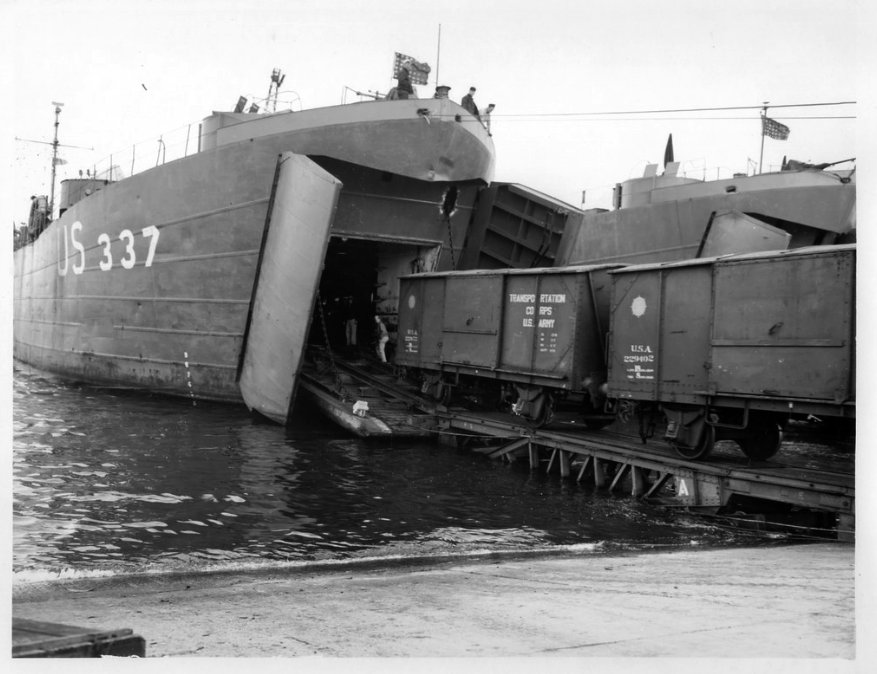 93k | USS LST-337 loading railcars in Southampton, England, 1944.