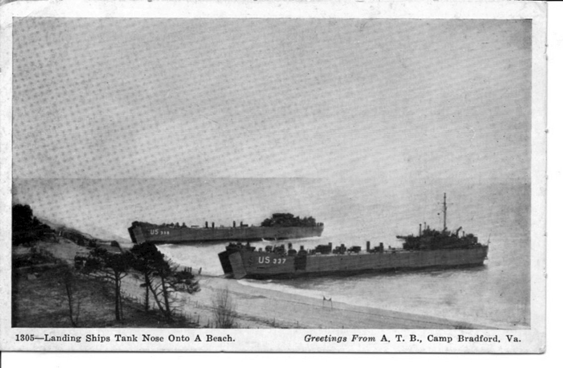 118k | USS LST-337 and USS LST-338 beached at Amphibious Training Base Camp Bradford, VA., circa 1943. US Navy photo postcard |