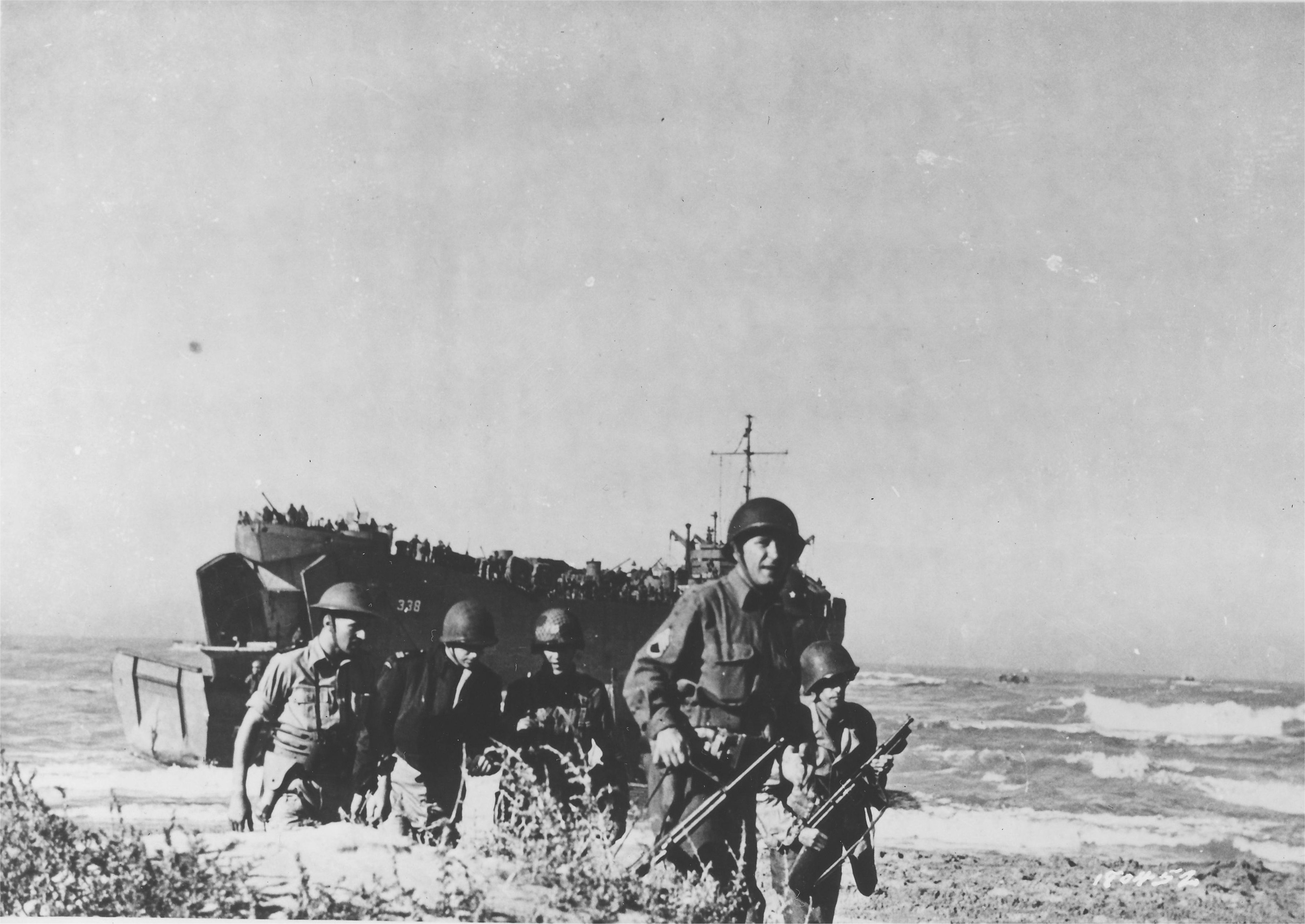 840k | USS LST-338 beached at the Gela beachhead, 10 July 1943, while unloading men and materials.