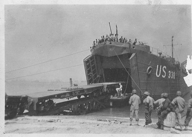 LST-338 is unloading tanks across a pontoon causeway. US Army Signal Corps photo. |